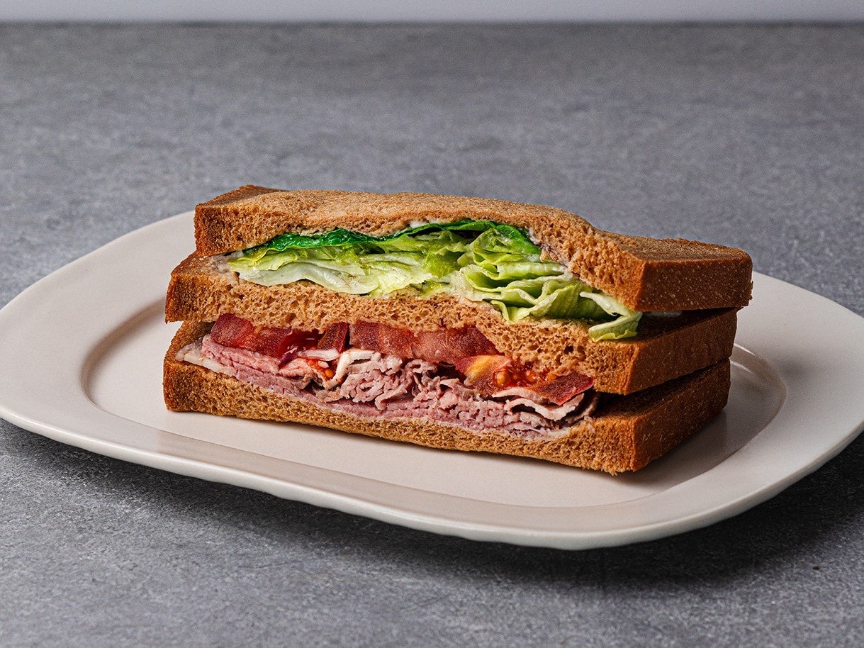 ジューシーな自家製ローストビーフに、トマトやレタスなど新鮮野菜もふんだんに入った豪華な一品。マヨネーズにレモンやヨーグルト、西洋ワサビなどを加えた特製ソースが絶品。ふんわりとした食感と歯切れのよさが特徴の焙煎全粒粉入りパンで挟みました。