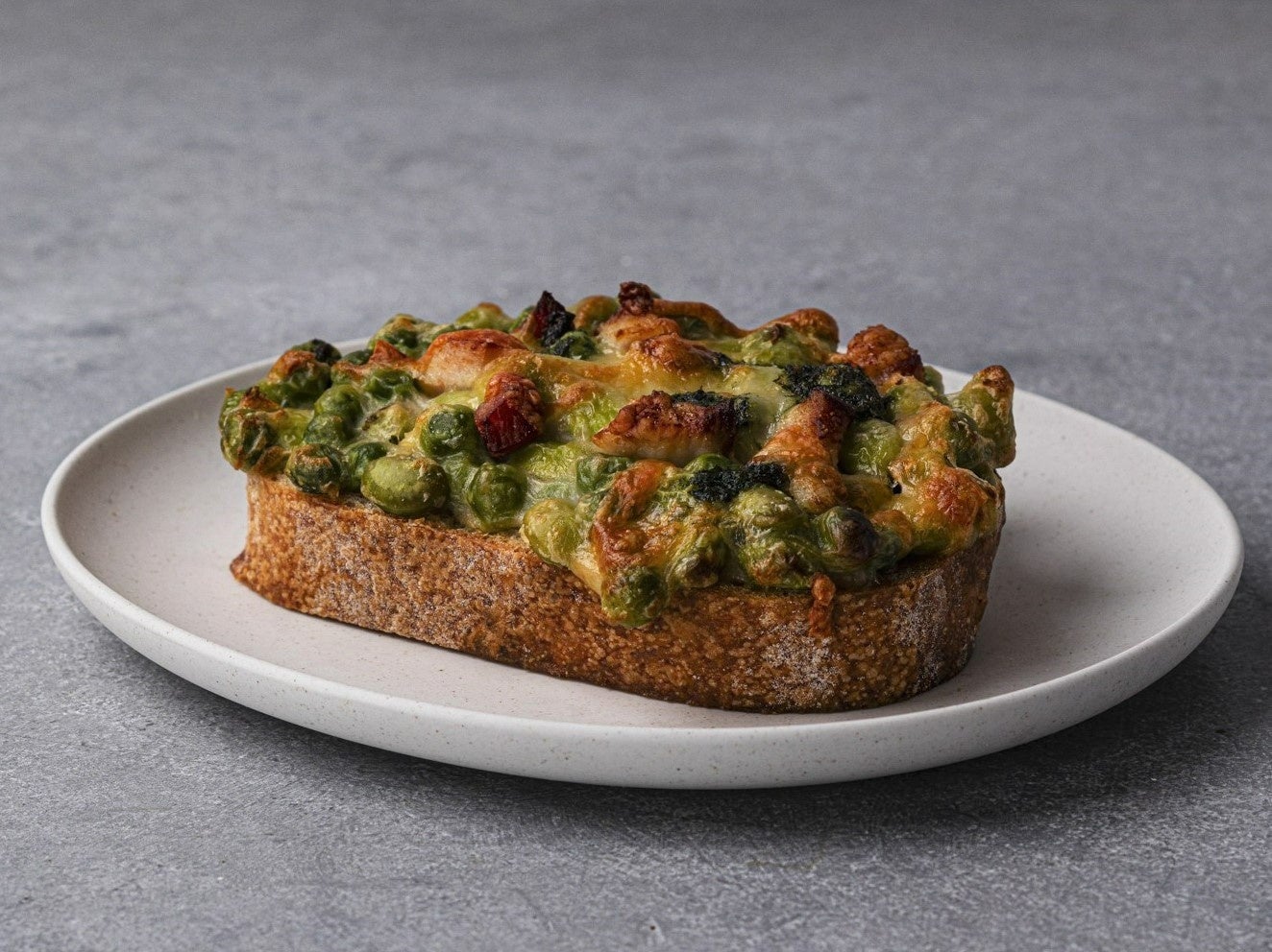 厳選した小麦のおいしさが伝わる長時間発酵のパンを使用した、具だくさんのフランス風オープンサンドです。上にはグリーンピースと枝豆がたっぷり、厚切りベーコンものせてボリュームたっぷり。自家製の香草バターの芳醇な香り・濃厚なコクが効いています。