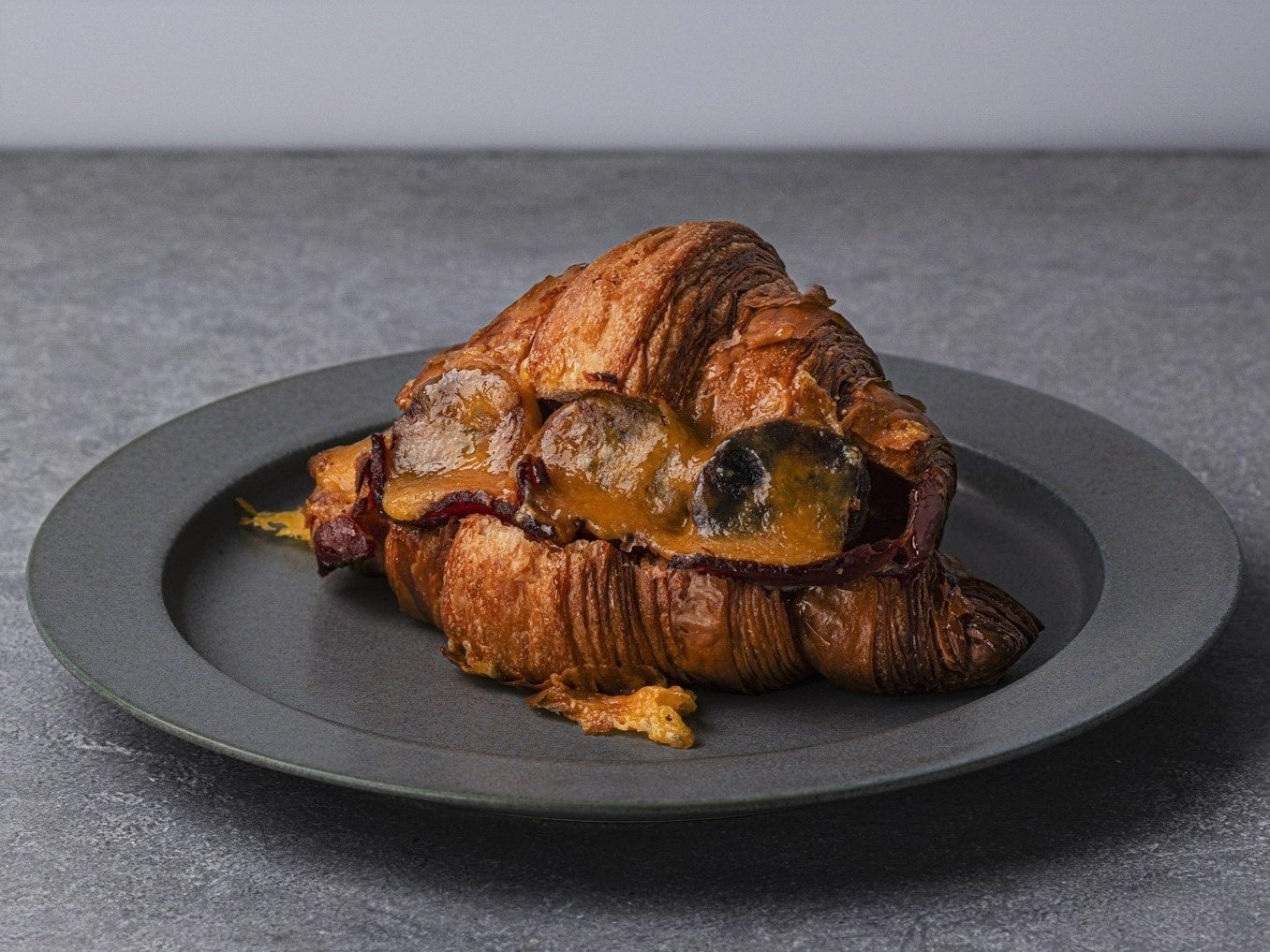 アメリカのロック歌手にちなんだ、甘くてしょっぱい、クセになる伝説のレシピをアレンジ。北海道産小麦と高級発酵バターを使ったクロワッサンに、ピーナッツバター、バターでソテーしたバナナ、カリカリに焼いたベーコンを組み合わせ、さらにチェダーチーズとメープルシロップを加えて、よりおいしく仕上げました。
