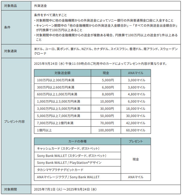 ソニー銀行への外貨送金で現金またはANAマイルプレゼント キャンペーン実施のお知らせ