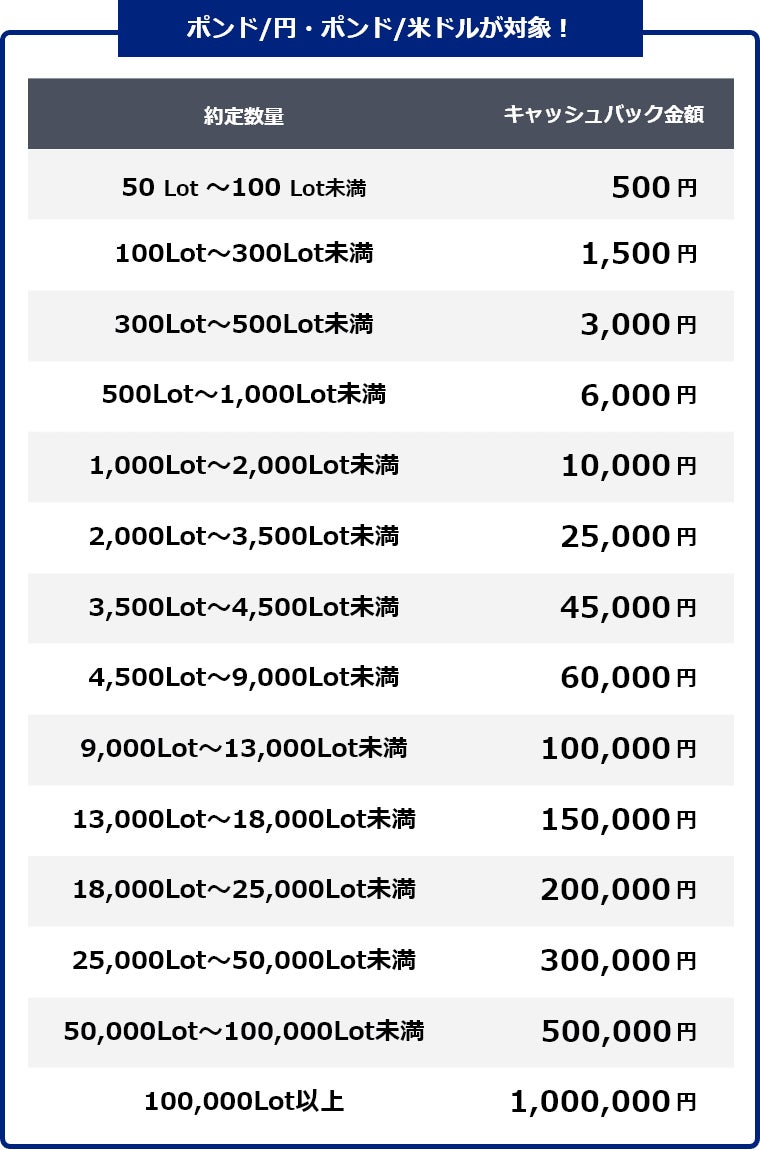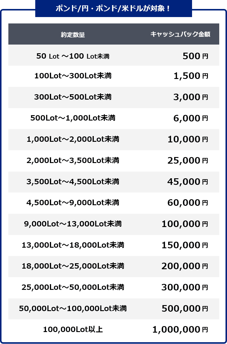 2023年12月1日(金)~2024年1月31日(水)の期間中、FX口座におけるポンド/円またはポンド/米ドル、それぞれの通貨ペアの新規取引の合計数量に応じて最大100万円(各通貨ペアごと)をキャッシュバックいたします。