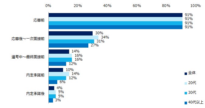続いて、転職活動中に、企業に関する社員クチコミを「見る」と回答した方に、どのタイミングで見るかを伺うと、91%が「応募前」と回答しました。社員クチコミサイトを見るタイミング別で、確認する理由や内容についてのコメントも紹介します。