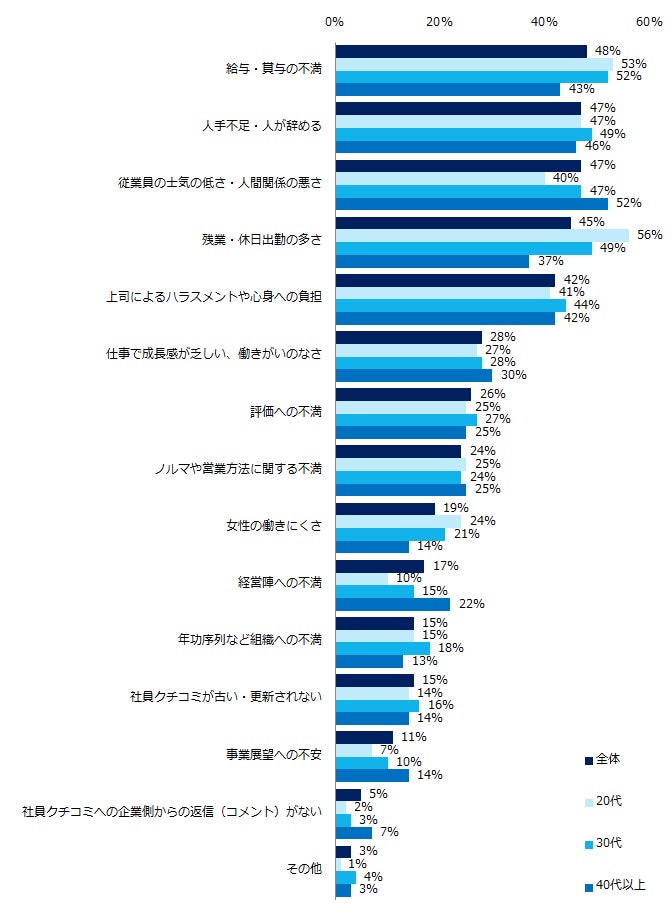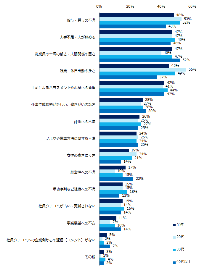 転職活動中に社員クチコミを見る方に、社員クチコミの影響で、応募や選考辞退、内定辞退をしたことがあるかを伺うと、67%が「応募を辞めた」経験があると回答しました。続いて、影響した社員クチコミの内容について伺うと、上位は「給与・賞与の不満」(48%)、「人手不足・人が辞める」「従業員の士気の低さ・人間関係の悪さ」(同率47%)でした。年代別では、20代が「残業・休日出勤の多さ」(56%)、30代「給与・賞与の不満」(52%)、40代以上「従業員の士気の低さ・人間関係の悪さ」(52%)が最多でした。