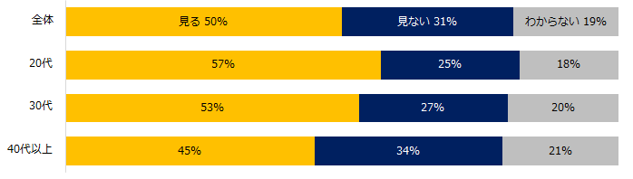転職活動中に、企業に関する社員クチコミを見るかを伺うと、50%が「見る」と回答しました。20代が40代以上よりも12ポイント高く、年代が低い方ほど、クチコミを見ることが分かりました。