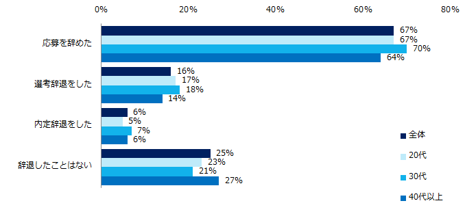 ★ 約7割が、社員クチコミの影響で応募や選考、内定を「辞退をしたことがある」と回答。影響した内容トップは、20代「残業・休日出勤」30代「給与・賞与」40代以上「士気の低さ・人間関係」。