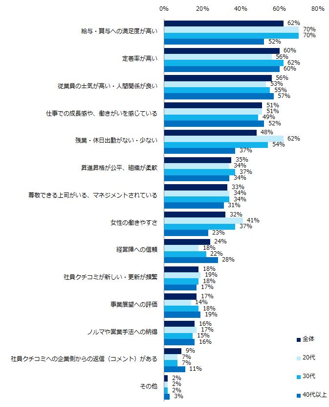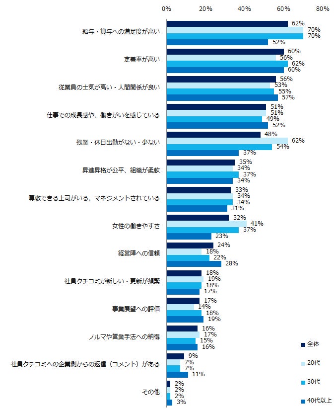 社員クチコミの影響で「応募を辞めた」「選考辞退した」「内定辞退した」と回答した方に、どんな内容の社員クチコミがあれば選考に進みたいと思うかを伺うと、 トップ3は「給与・賞与への満足度が高い」(62%)、「定着率が高い」(60%)、「従業員の士気が高い・人間関係が良い」(56%)でした。