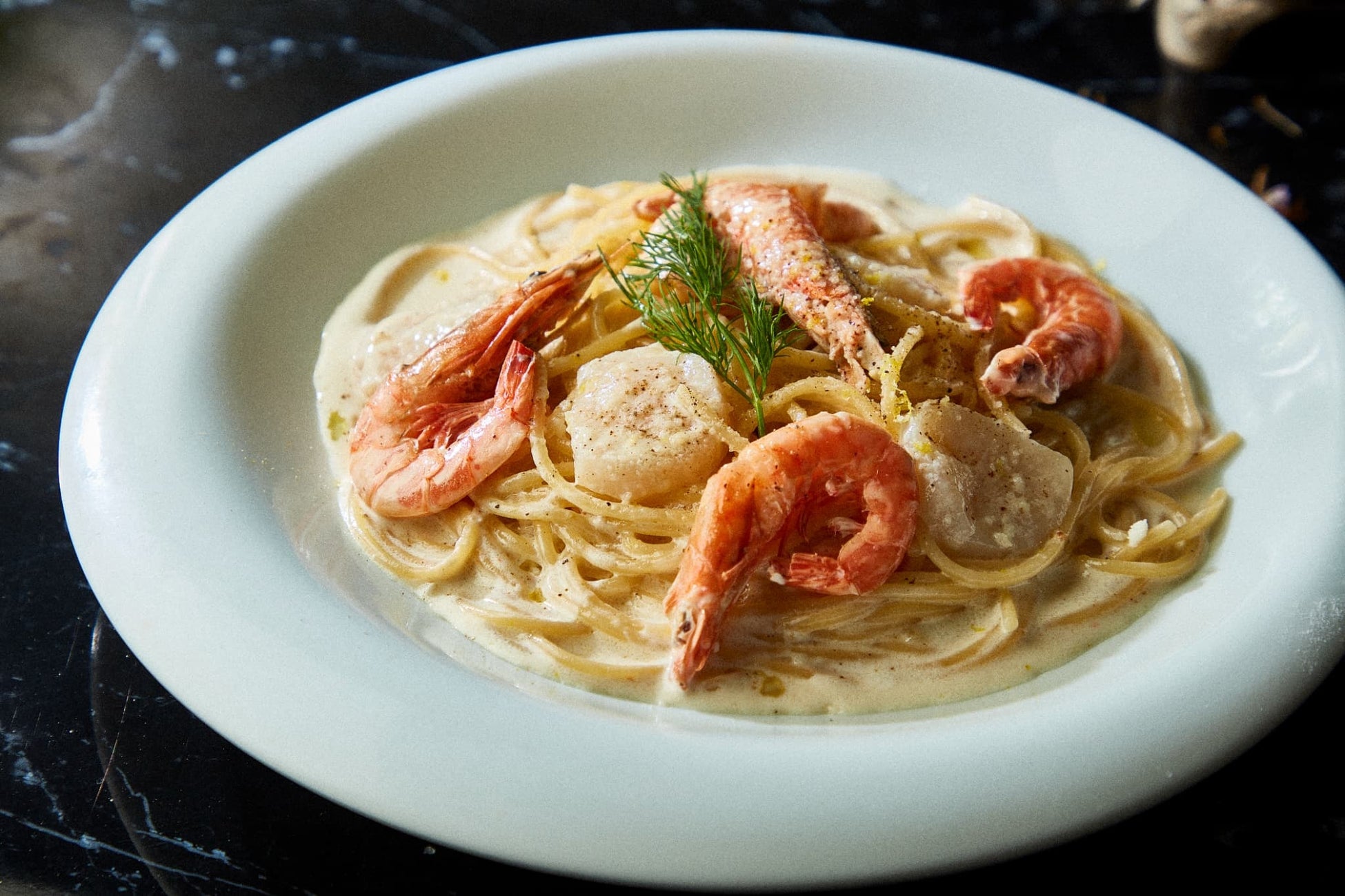 マスカルポーネチーズのソースに、マッシュルームとパンチェッタを散らし、スカモルツァチーズの味わいと香りと共にお楽しみください。
