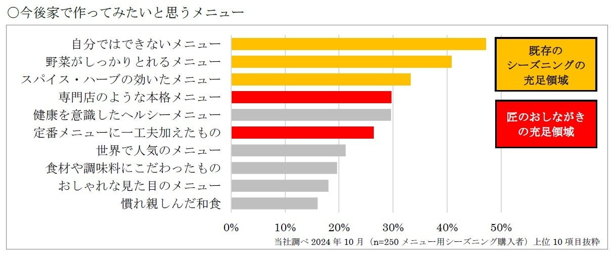 今後家庭で作ってみたいメニューの調査では、「自分では作れないメニュー」や「野菜がしっかりとれるメニュー」、「スパイスとハーブの効いたメニュー」に次いで、嗜好・ニーズの高次元化や新しい味わいへのチャレンジ意向の高まりから、「専門店のような本格的な料理」「定番メニューにひと工夫加えた料理」を求める方も一定数存在することが分かりました。
