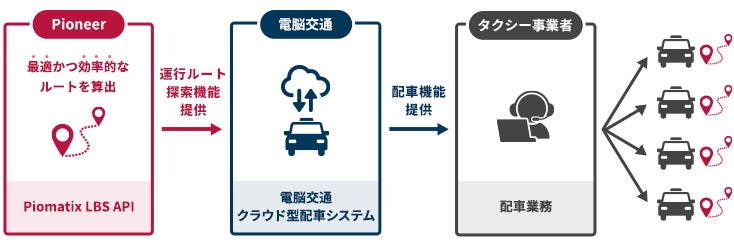 パイオニアのモビリティAIプラットフォームの新サービス「Piomatix LBS API」が、株式会社電脳交通(本社:徳島県徳島市、代表取締役:近藤 洋祐、以下「電脳交通」)のクラウド型タクシー配車システムに採用されました。配車システムにおける運行ルートの作成や、距離、所要時間の算出に「Piomatix LBS API」の「ルート探索API」が活用されます。