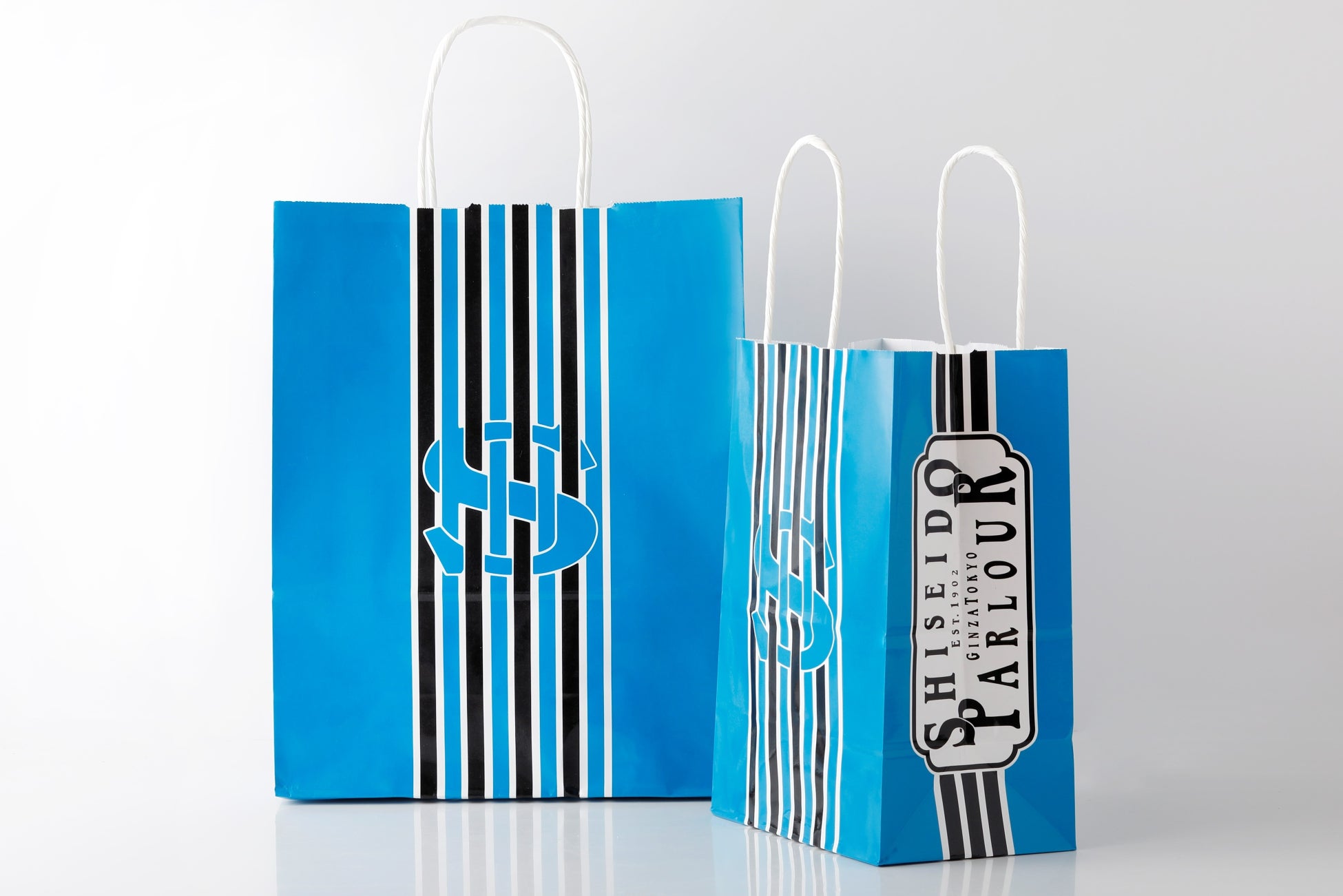 鮮やかなブルーのカラーと若々しくも力強いストライプが印象的なハンディバッグは、2015年に仲條正義氏によってデザインされました。パッケージや美味しさへのこだわりはもちろんのこと、資生堂パーラーのお菓子にはおもてなしの心が込められています。