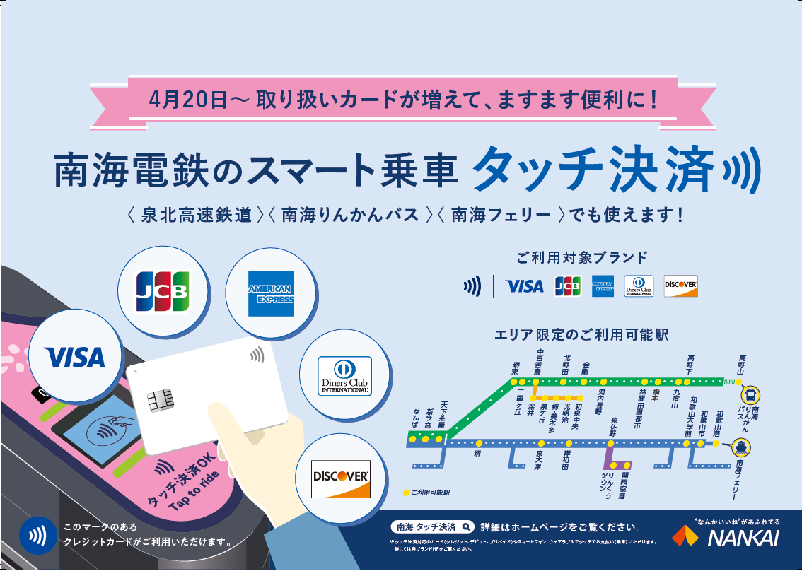 南海電気鉄道株式会社(社長:岡嶋 信行、以下「南海電鉄」)、泉北高速鉄道株式会社(代表取締役社長:金森 哲朗、以下「泉北高速鉄道」)、南海りんかんバス株式会社(取締役社長:和田 純一、以下「南海りんかんバス」)、南海フェリー株式会社(取締役社長:小林 敏二、以下「南海フェリー」)、株式会社ジェーシービー (代表取締役会長兼執行役員社長:浜川 一郎、以下「JCB」)、QUADRAC株式会社(代表取締役社長:高田 昌幸、以下「QUADRAC」)は、2023年4月20日(木)から、南海グループの鉄道・バス(一部)・フェリーで、JCB/American Express/Diners Club/Discoverのタッチ決済(以下「JCBのタッチ決済等」)による交通利用の取り扱いを開始します。