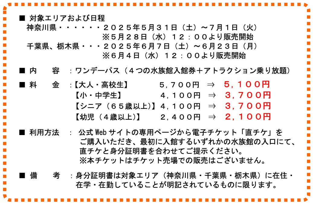 本キャンペーンは、6月2日(月)の開港記念日(神奈川県)、6月15日(日)の千葉県民の日と栃木県民の日に合わせ、関東3県の皆さまに日頃の感謝を込めて、水族館とアトラクションが楽しめるワンデーパスをお得な価格でご購入いただけるスペシャル企画です。
