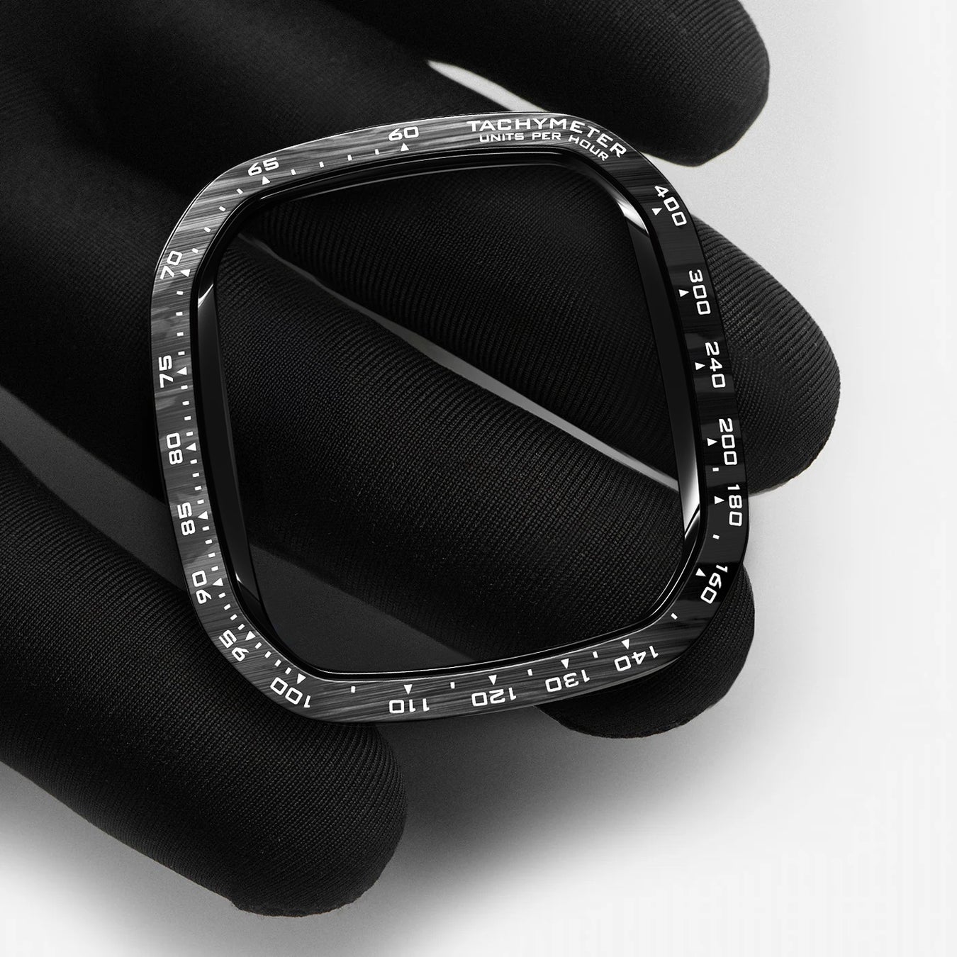 タキメーターモチーフのベゼルには、軽量かつ高強度のカーボン素材を採用。新たに加わったオールブラック仕様は、クラシックな佇まいにモダンでスポーティな魅力を融合させています。