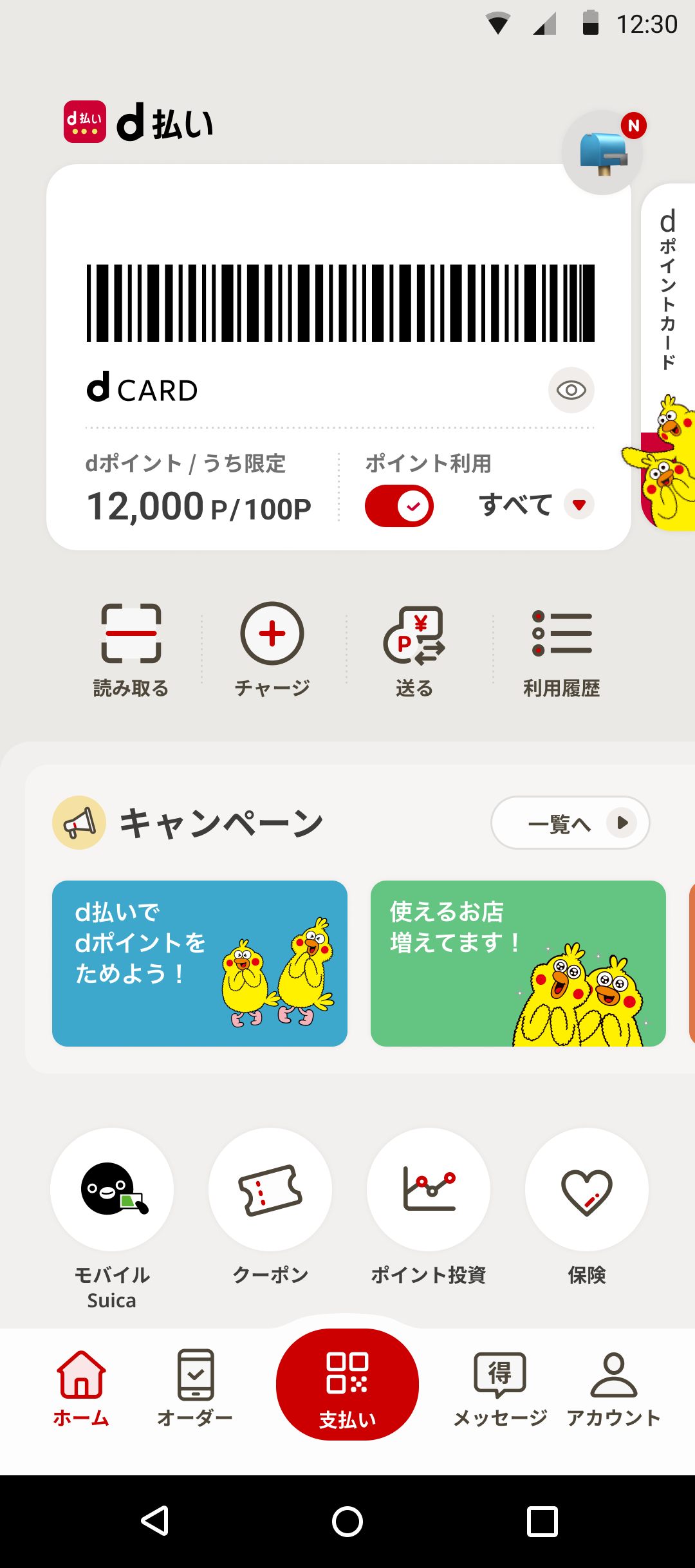 「d払い」アプリからSuicaへチャージいただくと、チャージ金額の0.5%(200円につき1ポイント)相当のdポイントを進呈いたします。Suicaへのチャージはdポイント(期間・用途限定ポイント含む)もご利用いただけます。ためたdポイントは1ポイント=1円としてSuicaにチャージいただけます。