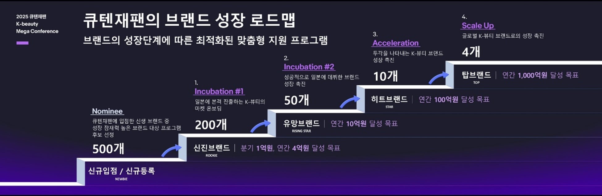 新しくスタートする「Qoo10 K-Beauty支援プログラム」は、韓国のビューティー関連企業の中で、日本や世界に進出したいと考えるK-Beautyインディーズブランド※に対する支援プログラムです。初年度の2025年度は、500のブランドを対象に審査を開始します。その後、最初のステージでは200ブランドを選定し、本プログラムを活用しながら次の段階へ成長できるよう、Qoo10が年間を通じサポートします。成長にあわせて全部で4ステージを設けており、最終ステージでは日本トップクラスの人気ブランドに成長することを目的とします。