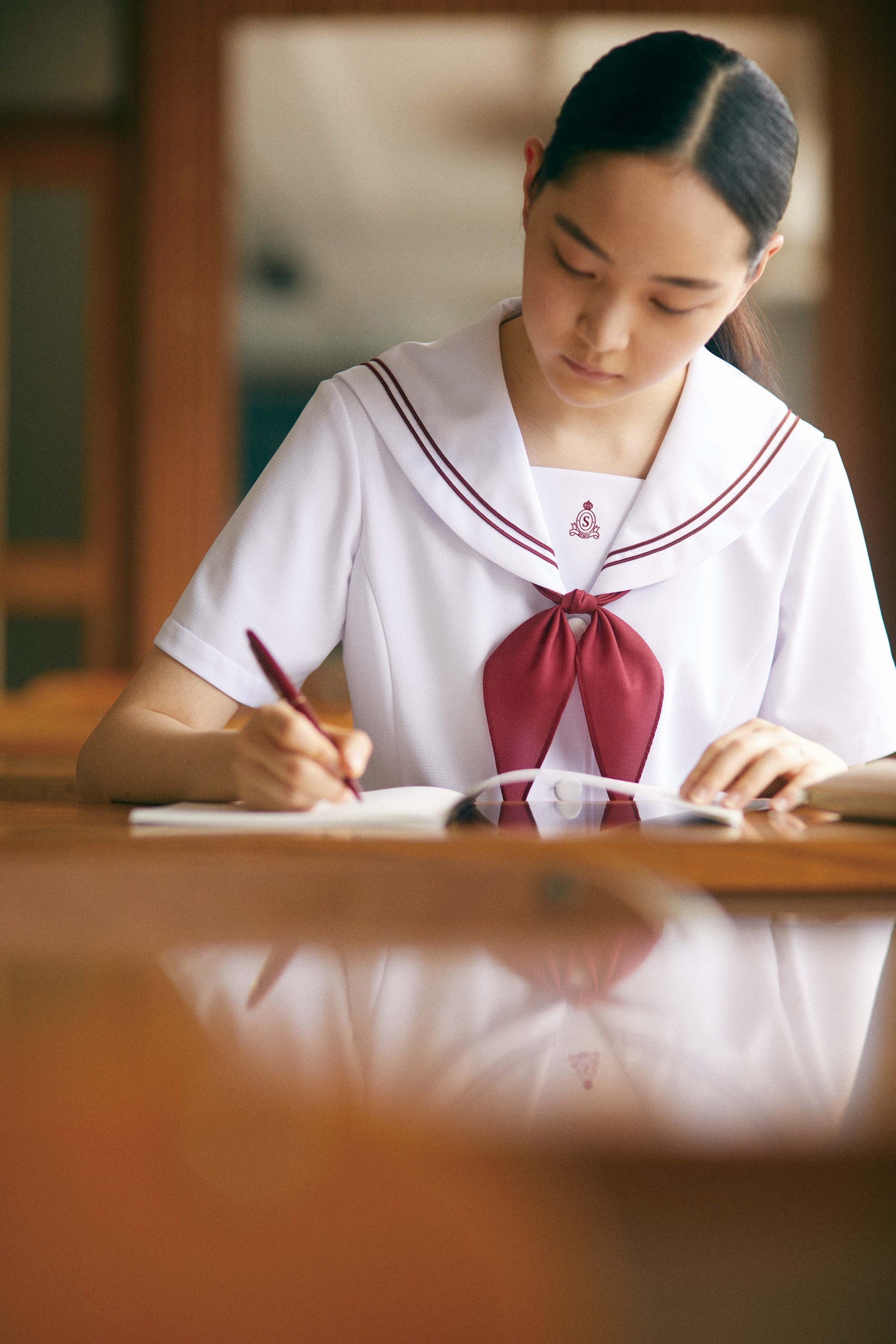 デザインを決める上で大切にしたのは、時を経ても廃れないものでありたいということ。いずれは過去になる高校生活の貴重な時間が、想い出となった未来にも輝くためには、3年を共に過ごす制服のデザインにも普遍性を宿していて欲しいと考えました。そこで、FUDGEが愛し、得意とするトラッドテイストをキーワードに、英国調の赤いタータンチェック、クラシックで優美なブラックジャケット、モダンな配色にこだわったレジメンタル・タイなどを選択。そして普遍的にクラシックな魅力を放つセーラーカラーを男子制服にも採り入れて、他校にはない懐かしくも新しい個性を表現しました。