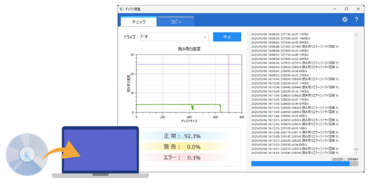 ”劣化判定ツール”では、ディスクのエラーの有無や読み込みリトライが行なわれているかをチェックし劣化の状態がわかります。このツールはプレスされたディスクの判定も可能です。