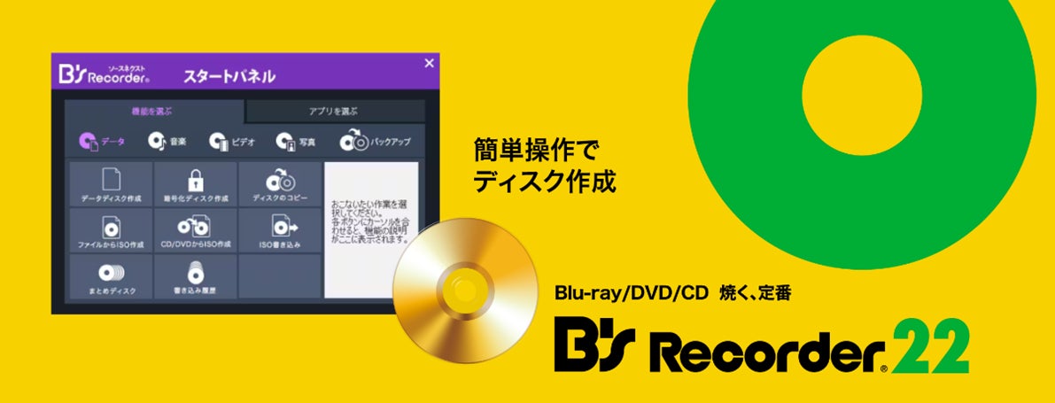 「B’s Recorder 22」は、CDやDVD、Blu-rayなどのディスクの書き込みはもちろん、音楽CD、DVDビデオやHDD/SSDのリカバーディスクの作成からファイルやディスクの暗号化、スマホ内の写真の取り込みまでディスク作成からバックアップまでできる通常版です。