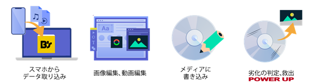 スマホから画像や動画の取り込み、web動画の録画、フォトムービーの作成など多彩な機能。さらに動画や音楽の編集や形式変換。そして、それらを「B's Recorder」でディスクにできます。