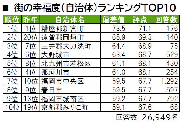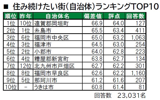 1位は2年連続で、唯一偏差値70台の糟屋郡新宮町で、「街に誇りがある(自治体)」でも3位と高い評価を得ています。2位は遠賀郡岡垣町で、昨年20位から大きく順位を上げており、「住み続けたい街(自治体)」でも1位の高評価を得ています。3位は、三井郡大刀洗町です。