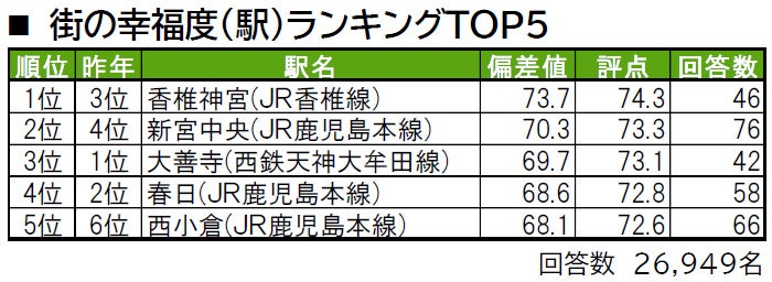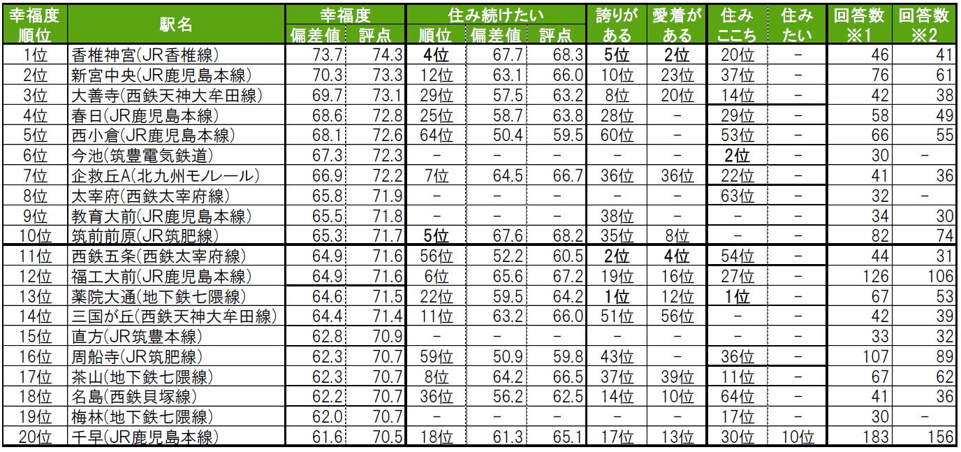 1位は福岡市東区にある香椎神宮で、「街に愛着がある(駅)」2位、「住み続けたい街(駅)」4位、「街に誇りがある(駅)」5位と、各ランキングで上位に入っています。2位は新宮中央で、「街の幸福度(自治体)」で1位の糟屋郡新宮町にある駅です。3位は、久留米市にある大善寺です。