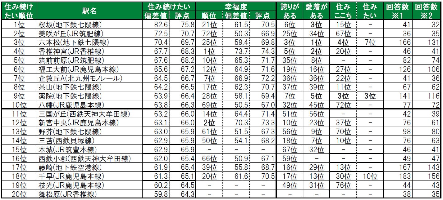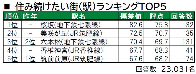 1位は、唯一偏差値80台の高い評価を得ている桜坂で、「街に愛着がある(駅)」でも3位となっています。2位は美咲が丘で、「住み続けたい街(自治体)」で2位の糸島市にある駅です。トップ2は、昨年は累計回答数が30名未満だったためランキング集計対象外だった駅です。3位は六本松で、「街に愛着がある(駅)」1位、「街に誇りがある(駅)」3位、「住みここち(駅)」4位と、各ランキングで高い評価を得ています。