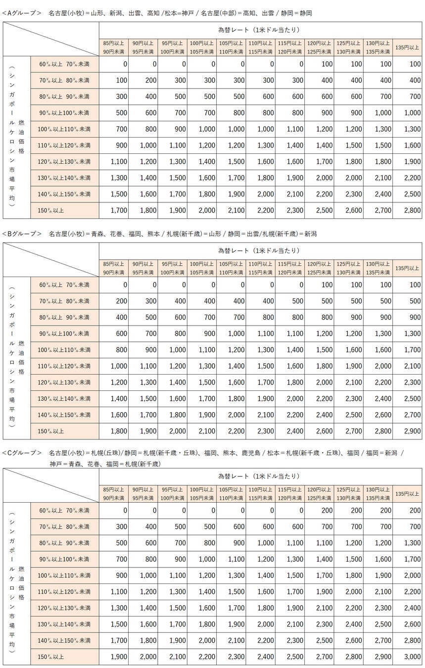 なお、燃油特別付加運賃は、シンガポールケロシン市況価格および為替レートの変動に応じて、1ヶ月毎に見直しております。