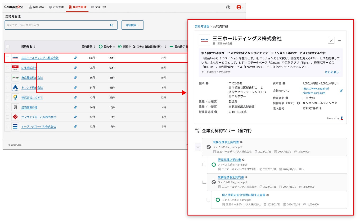本機能によって、取引先が一覧になっている管理画面上で契約情報とともに、企業ロゴ、住所、会社概要、業種、従業員数、資本金、会社HP、代表者名といった情報が掲載されるようになります。取引先ごとの詳細画面にも遷移でき、企業情報と、契約書数といった締結している契約情報をContract One上で確認できます。