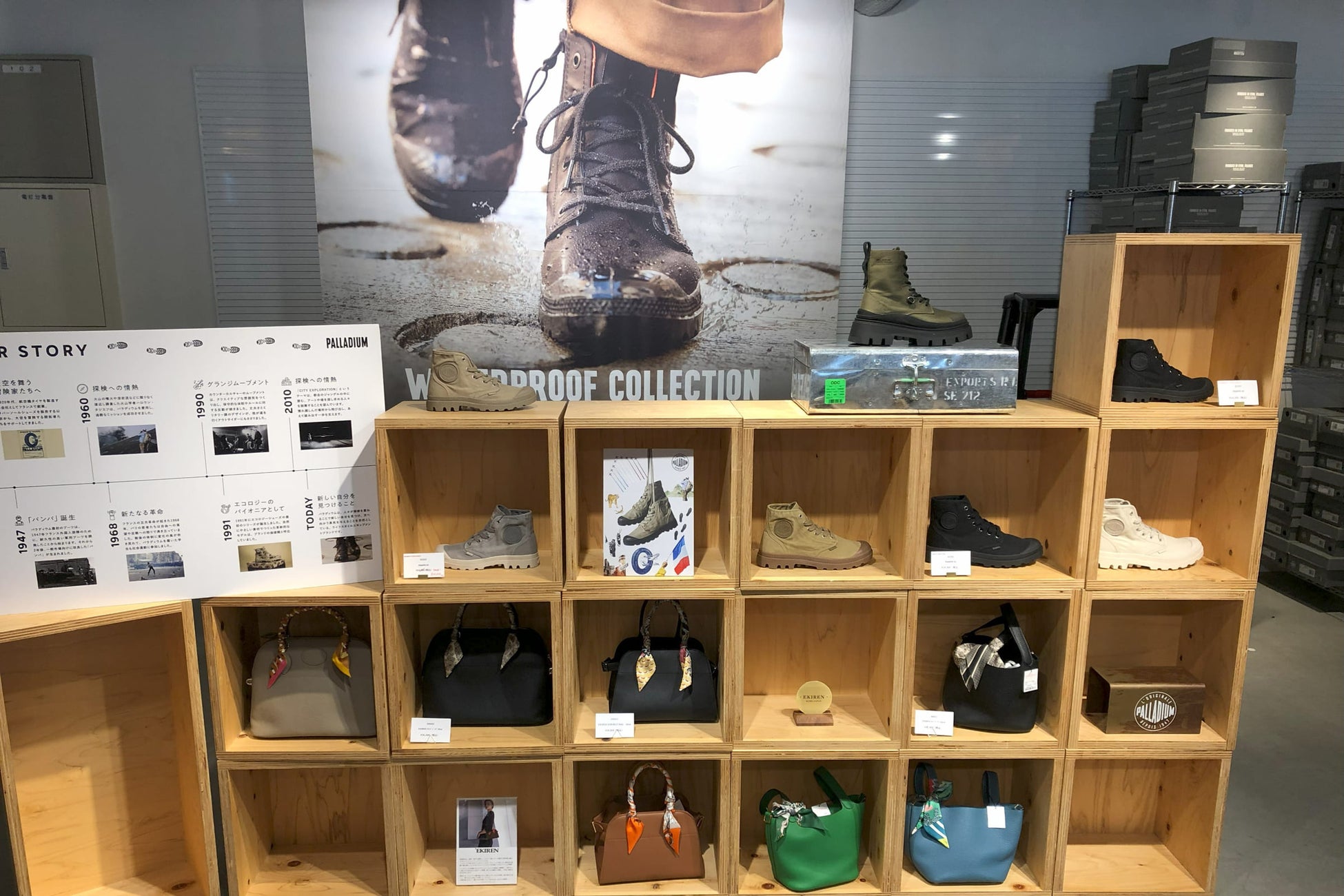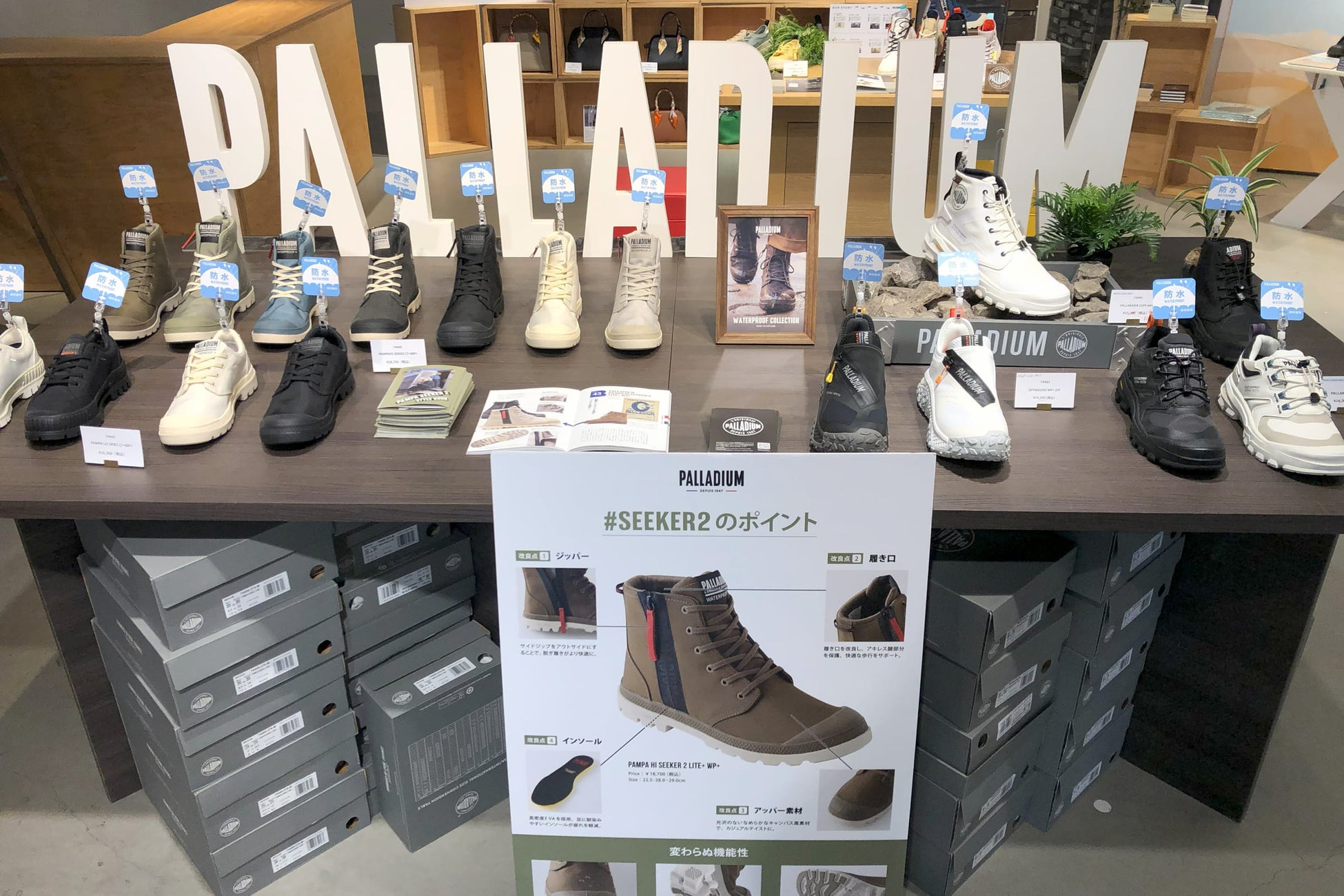 名古屋みなと蔦屋書店で展開するパラディウムのポップアップショップは、7月15日までの期間限定。防水シリーズやサンダルが並んでいます。