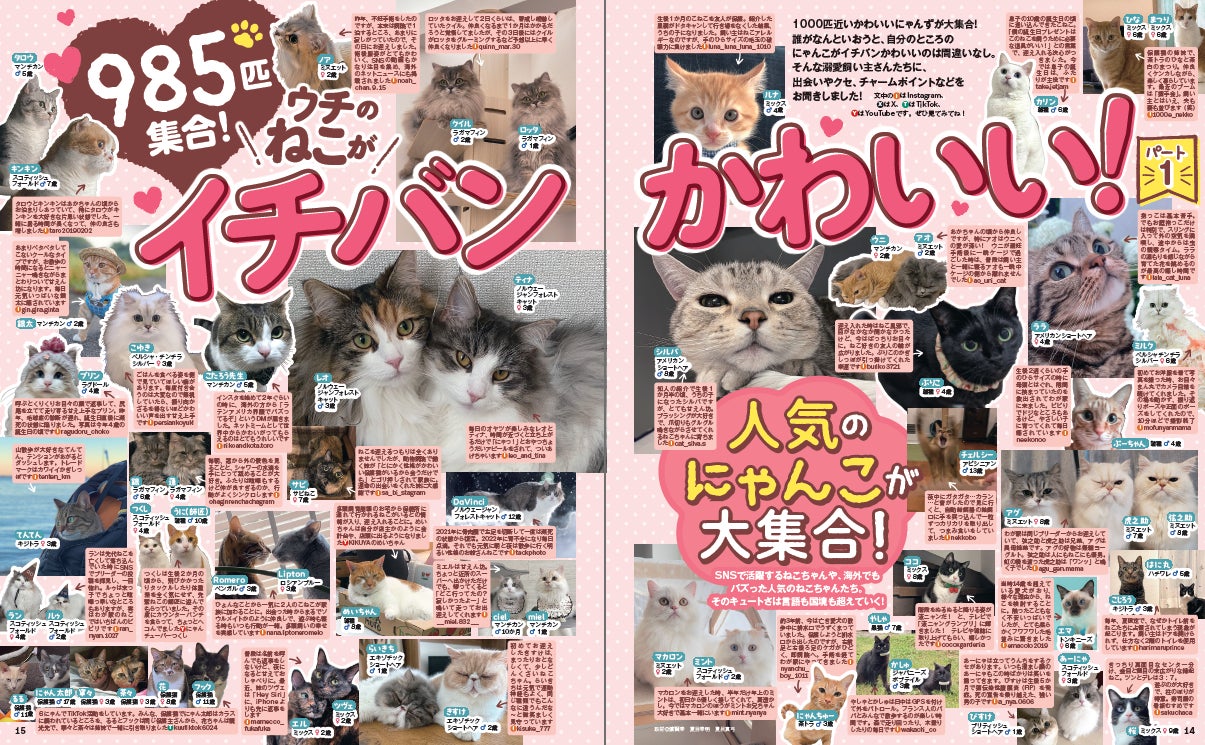 「人気ねこ」「赤ちゃんねこ」「保護猫」「仲良しねこ」「おめかしねこ」「もふもふねこ」「イケメンねこ」「美人ねこ」「ねこでひとこと」とジャンル分けをして全25ページにわたり、985匹のにゃんこを紹介しています。ねこで埋め尽くされた圧巻のページを隅々までご覧ください!