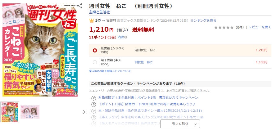※楽天ブックス日別ランキング(2024年12月3日付)、猫部門で1位になりました。