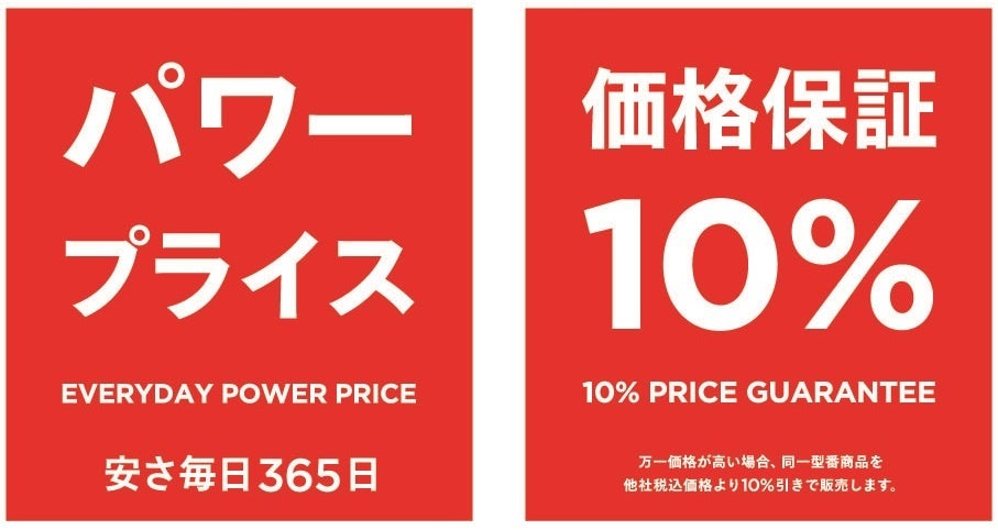 店内すべての商品をいつでも低価格の「パワープライス」で販売し、万が一価格が高い場合は同一型番商品を他社税込価格より10%引きで販売いたします。