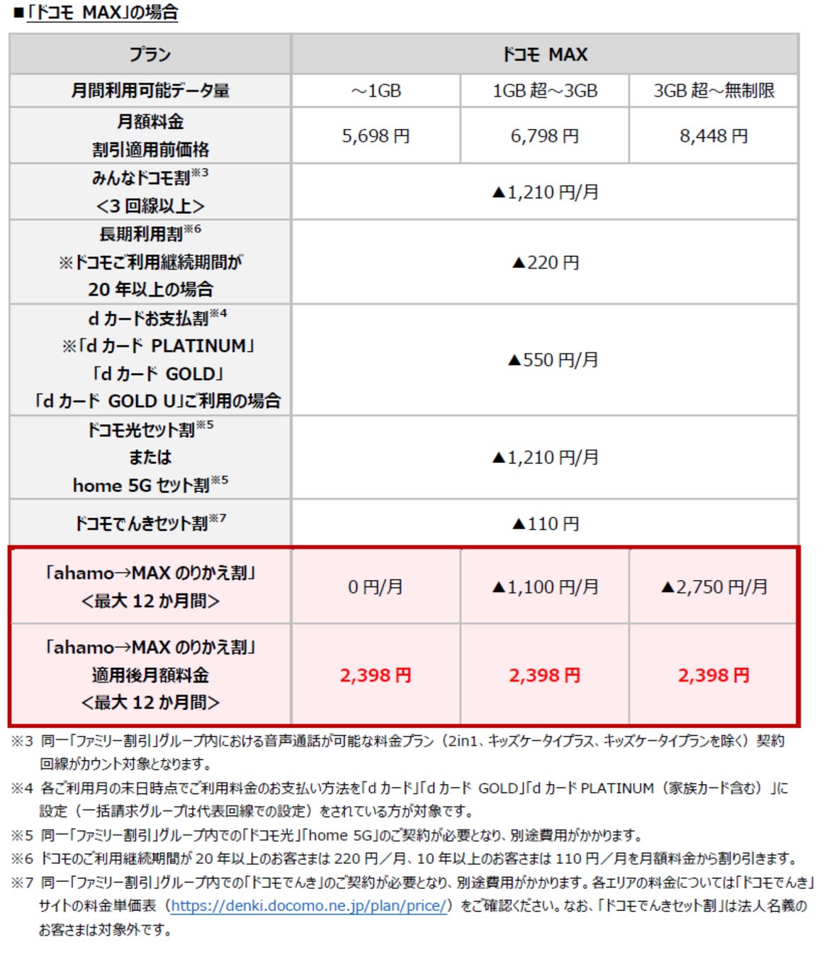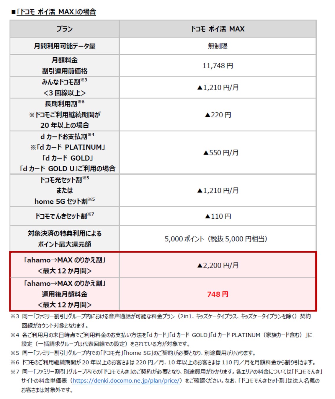 ト割※5/home 5G セット割※5」「長期利用割※6」「ドコモでんきセット割※7」を適用した場合、「ドコモ MAX」が月額2,398円(税込)からご利用いただけ、「ドコモ ポイ活 MAX」は「ドコモ ポイ活 MAX特典」を適用することで、実質月額748円(税込)からご利用になれます。