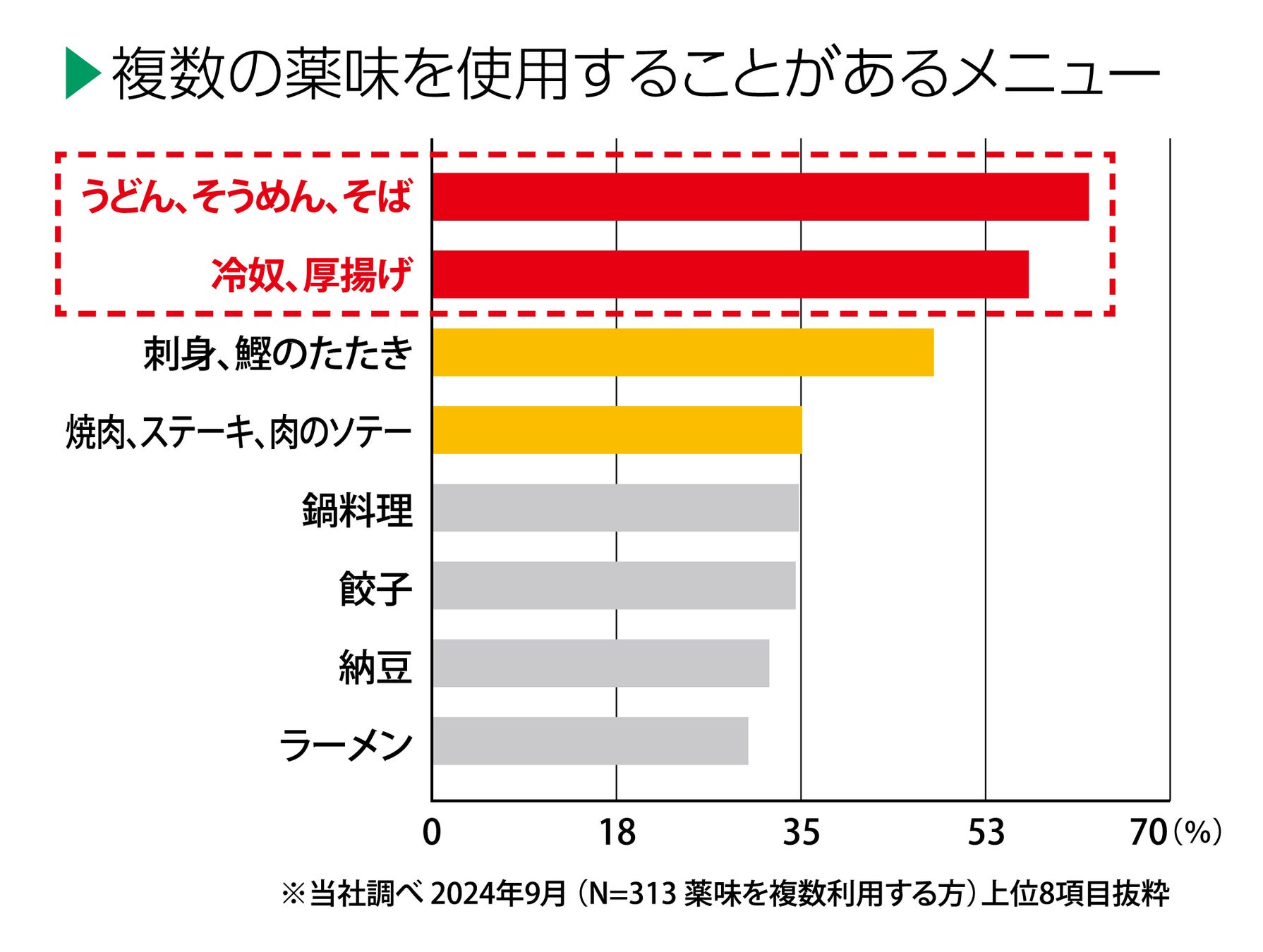 中でも、うどんなどの麺類や冷奴など、和のメニューで複数の薬味を使用していることが分かります。