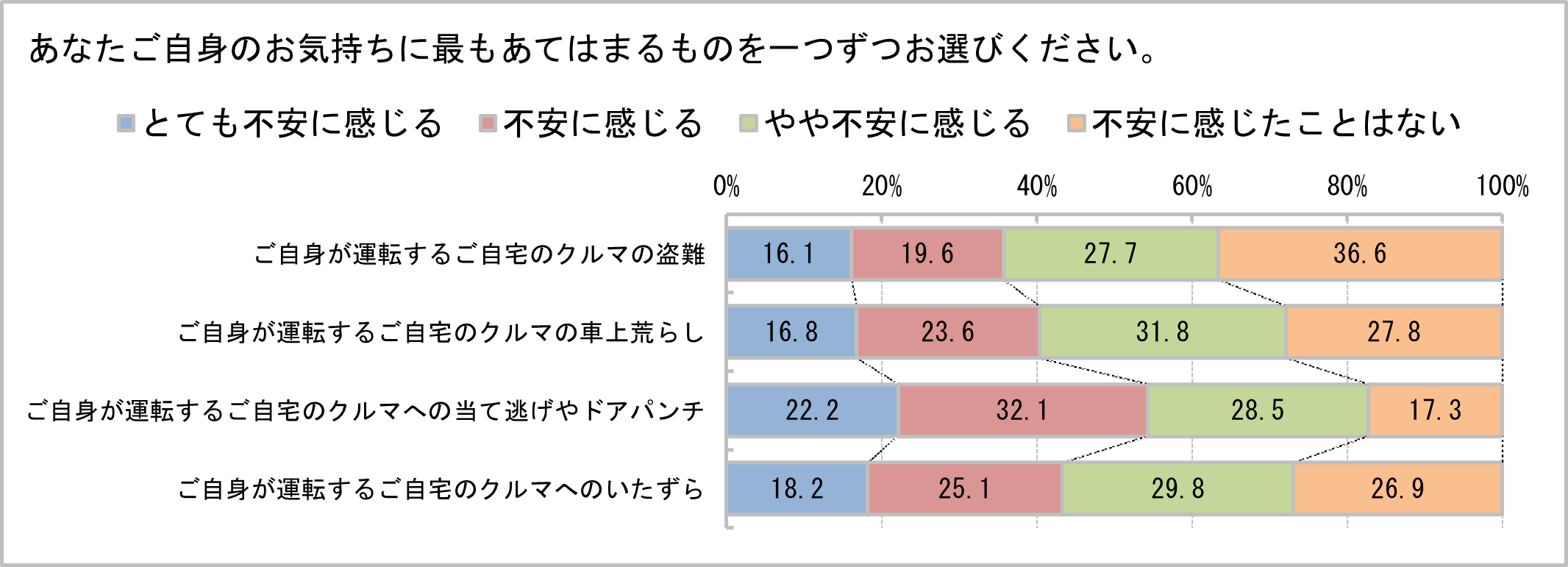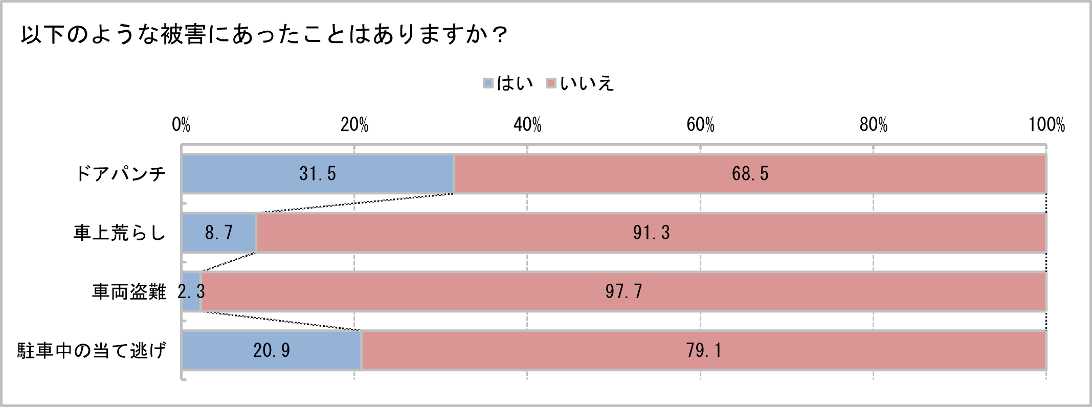 パイオニアが実施した「ドライブレコーダーの利用状況に関する調査」によると、ドライバーの82.7%がドアパンチに対して不安を、72.2%が車上荒らしに対して不安を感じていることが明らかになりました。また、ドライバーの31.5%がドアパンチ、20.9%が当て逃げの被害を受けたことがあると回答しています。