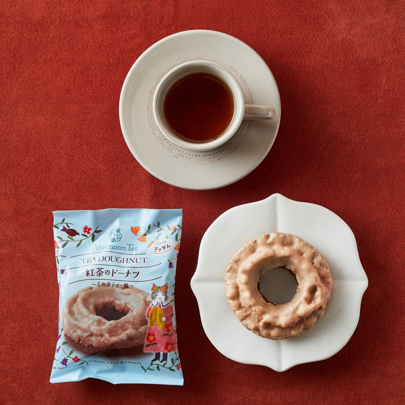 濃厚なコクと芳醇な香りが特徴の紅茶アッサムを牛乳とともにあわせた生地に、さらにパウダー状の茶葉を加えることでより紅茶の味わいが感じられるドーナツに仕上げました。ミルクティー風チョコレートをコーティングし、ミルクティーのような風味が楽しめるドーナツです。