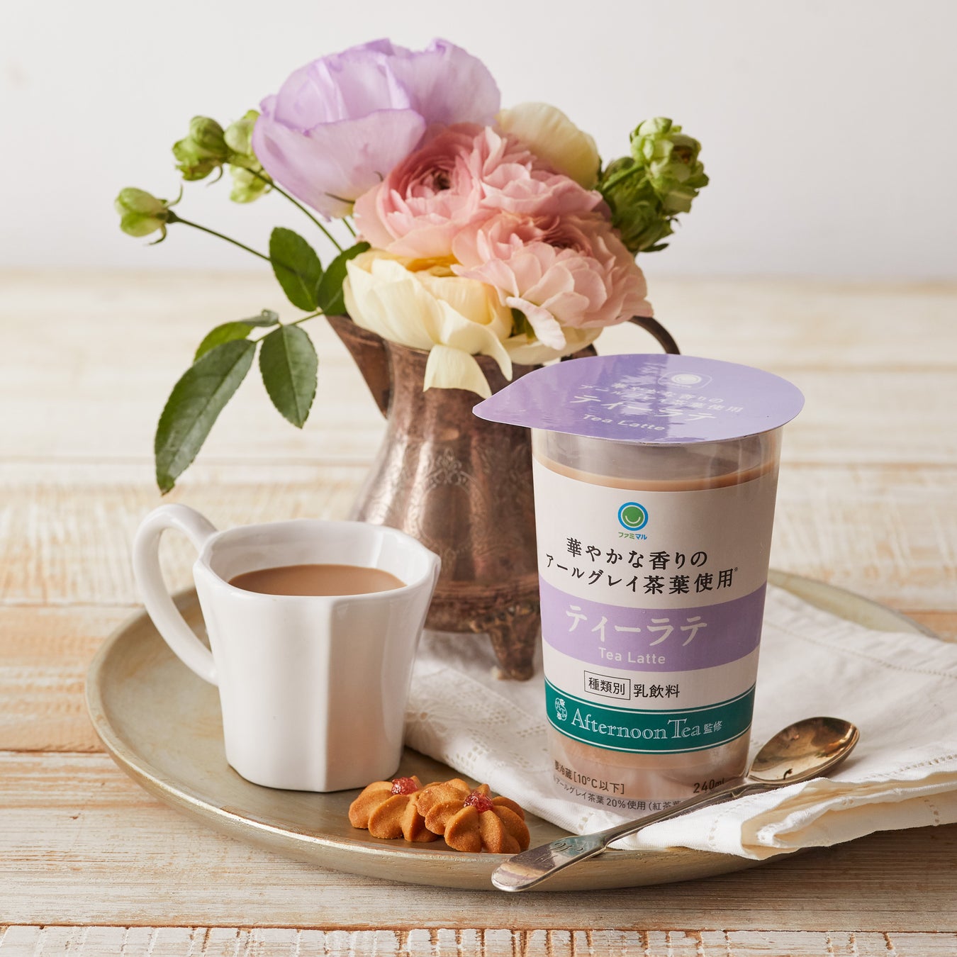 「おいしい◎うれしい◎あんしん◎」のファミマルは、“家族の日常を豊かにする”ファミリーマートのプライべートブランドです。気軽に、親しみあるコンビニエンスストアで、ティータイムがちょっと豊かになる提案が、チルド飲料を通じてお届け出来たらと開発した「ファミマル Afternoon Tea監修 ティーラテ」は、アールグレイの豊かな味わいが楽しめる紅茶ブランドAfternoon Tea監修ならではのドリンクに仕上げています。