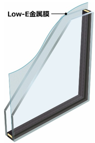 Low-EガラスはLow-Emissivity(低放射)ガラスの意味で、ガラス表面に熱の伝わりを抑える特殊な金属膜をコーティングしています。一般的な板ガラスと比べて断熱性や遮熱性に優れ(※1)、住宅・ビルの快適さや人々の健康面、そして省エネルギー性に効果を発揮します。