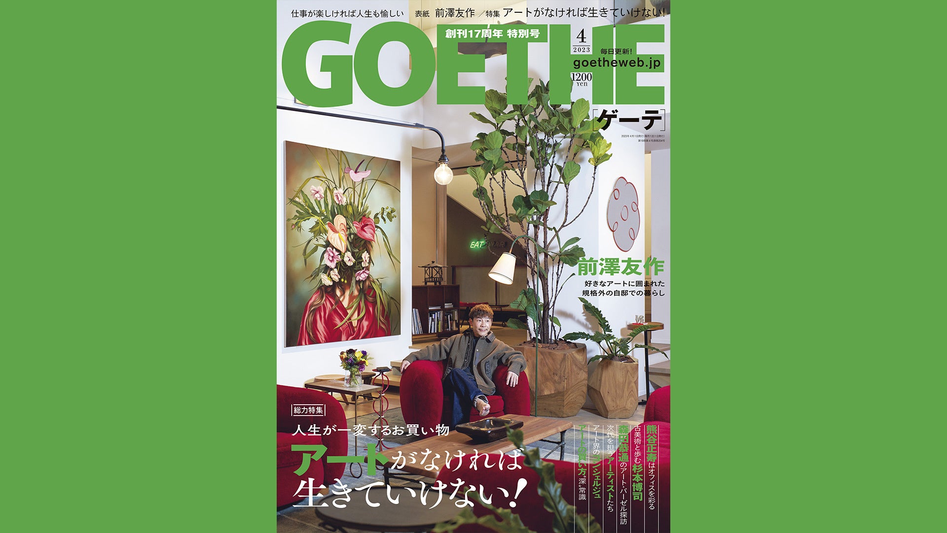 仕事に遊びに一切妥協できない男たちが、人生を謳歌するためのライフスタイル誌[ゲーテ]4月号が2023年2月25日に発売となる。今号の表紙を飾るのはスタートトゥデイ代表取締役社長・前澤友作。特集では、アート沼にどっぷりはまったコレクター12人のアートライフをご紹介。そのほかプロサッカー選手・田中碧選手や、映画・湯道の企画・脚本を務める小山薫堂氏&主演・生田斗真氏のインタビューも必見だ。ゲーテ公式ECサイト「ゲーテストア」限定アイテムもお見逃しなく!