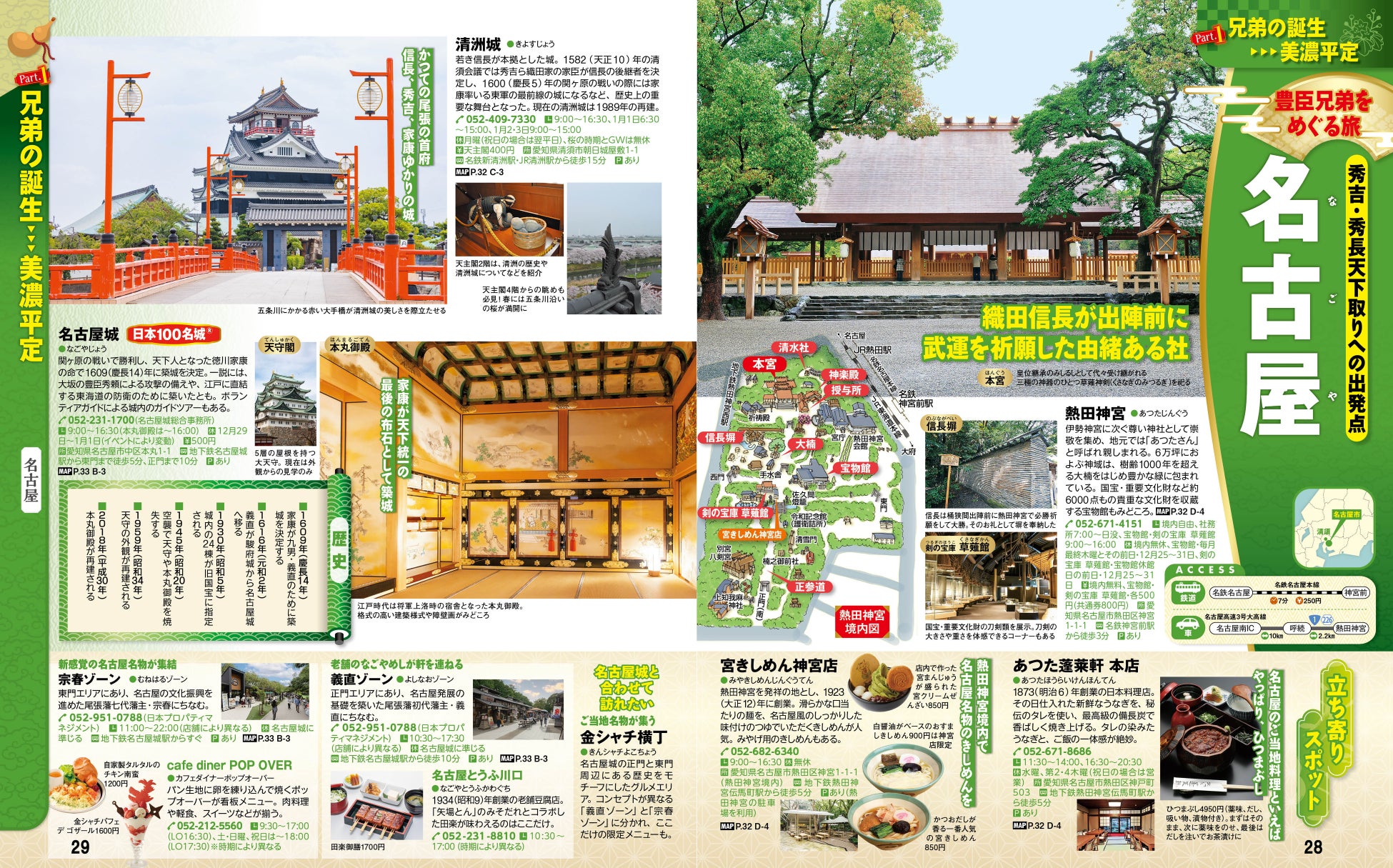 名古屋、岐阜、長浜、姫路、大和郡山など、今に伝わるゆかりの場所やエピソードとともに、周辺観光が楽しめる「まっぷる」ならではのガイドページもふんだんに収録しています。
