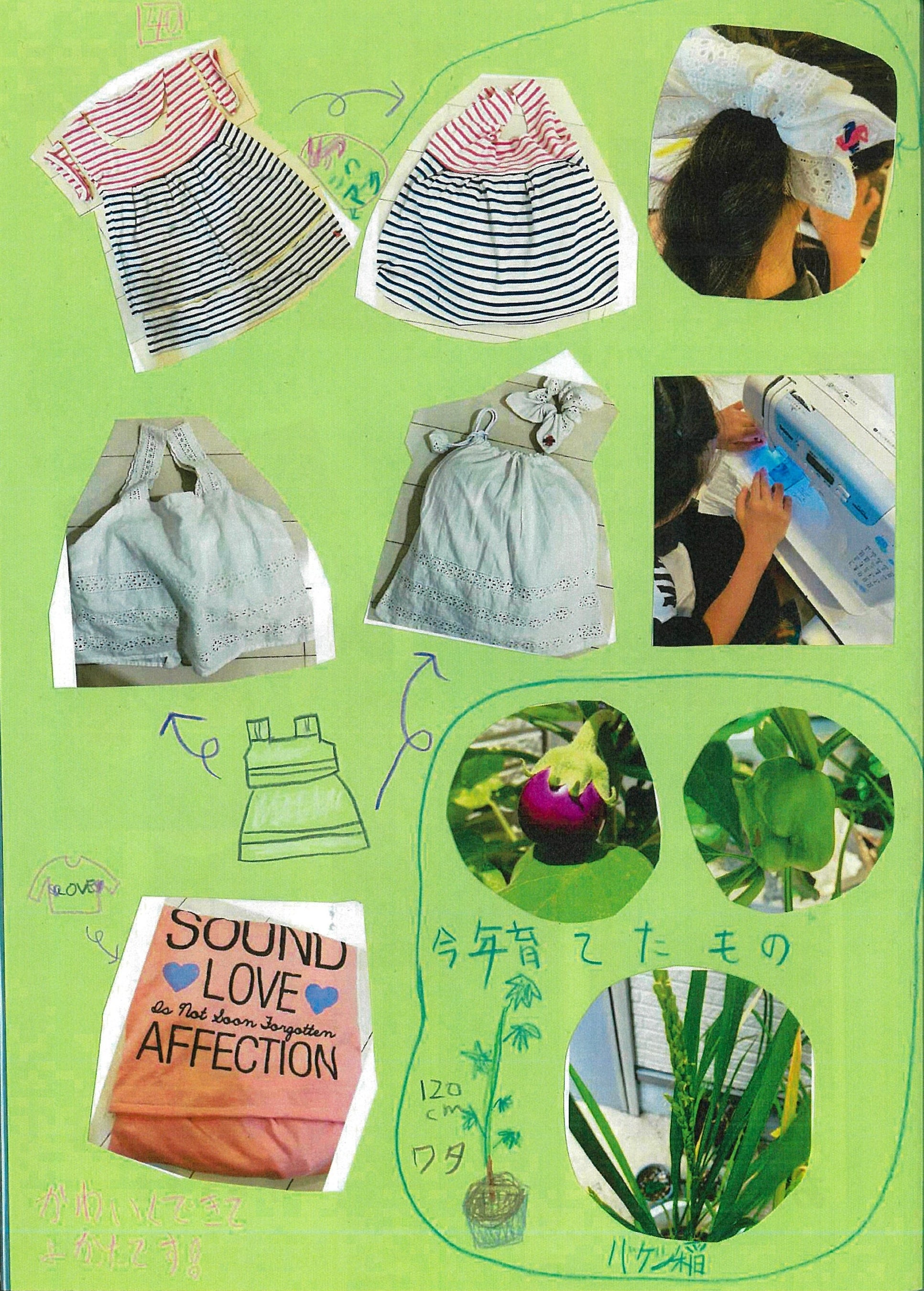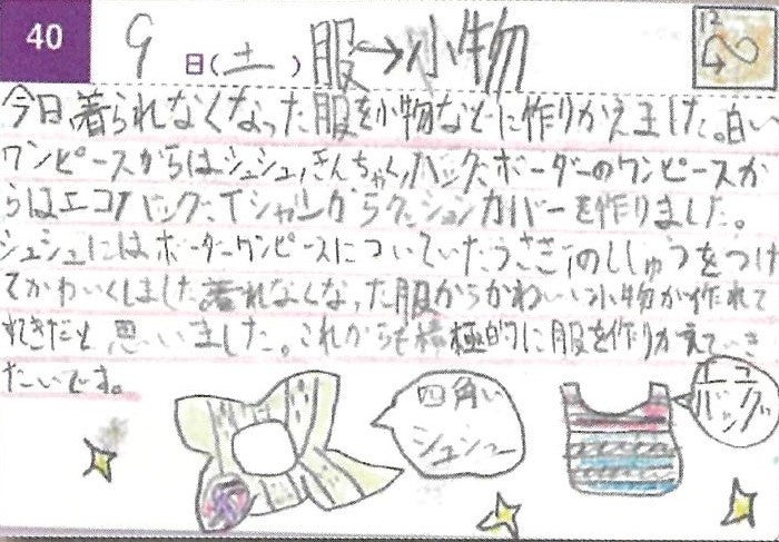 「SANYO服福賞」をもらったとき、「今まで環境日記を頑張って取り組んでよかった」と思いました。私は、普段から工作や裁縫をすることが好きなので、今回の環境日記で3つのリサイクルに取り組みました。1つ目の髪の毛につけるシュシュは、おばあちゃんにもらった服をリメイクして作りました。2つ目は、小さい頃に着ていた習い事のチアの服がお気に入りだったので、その服で巾着を作りました。3つ目のマイうちわは、裏紙を使用して作りました。自分が好きで取り組んだことが環境日記に生かせ、賞も取れたことが何より嬉しかったです。これからも楽しくリサイクルを続けて、環境に良い取り組みをしていきたいと思います。