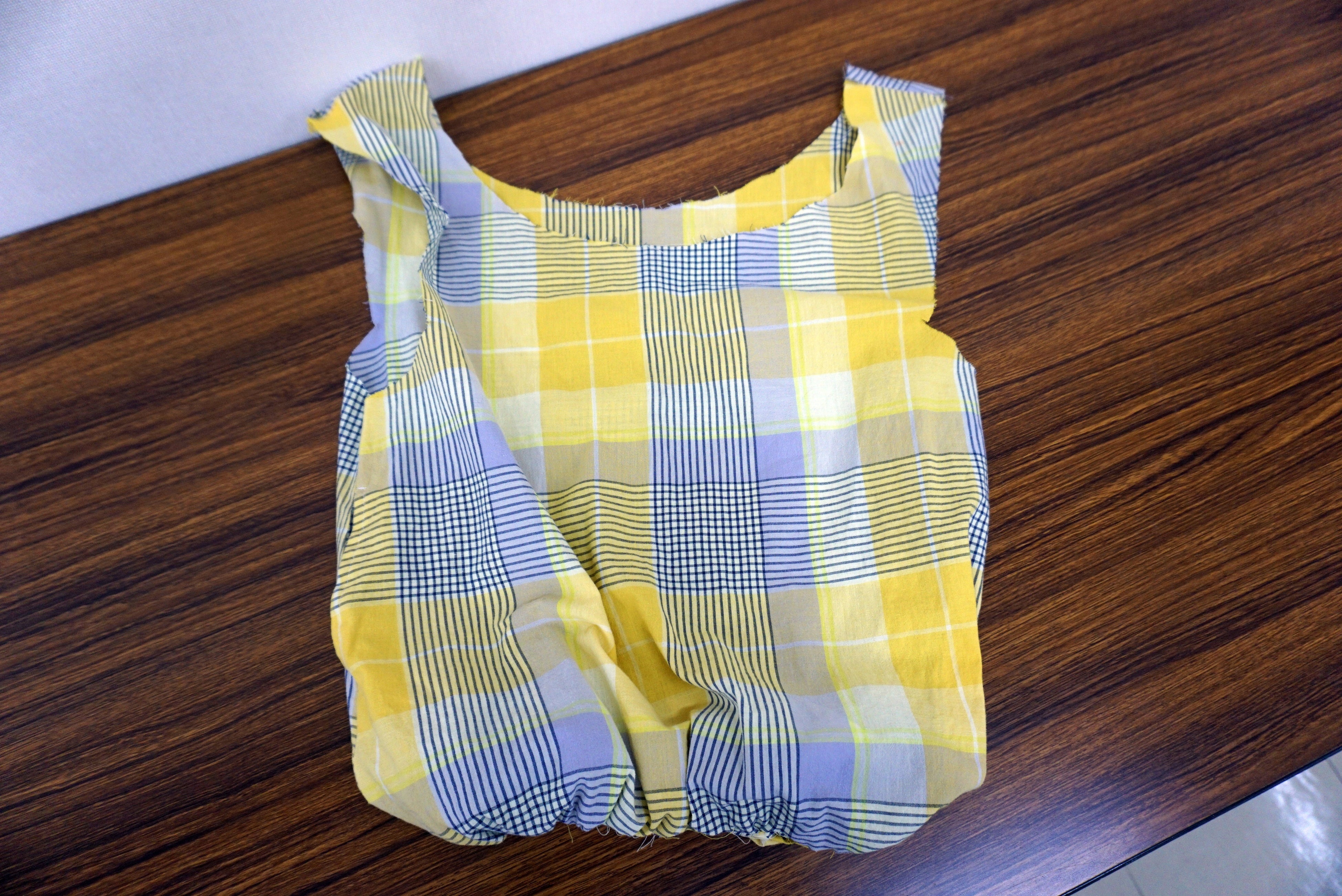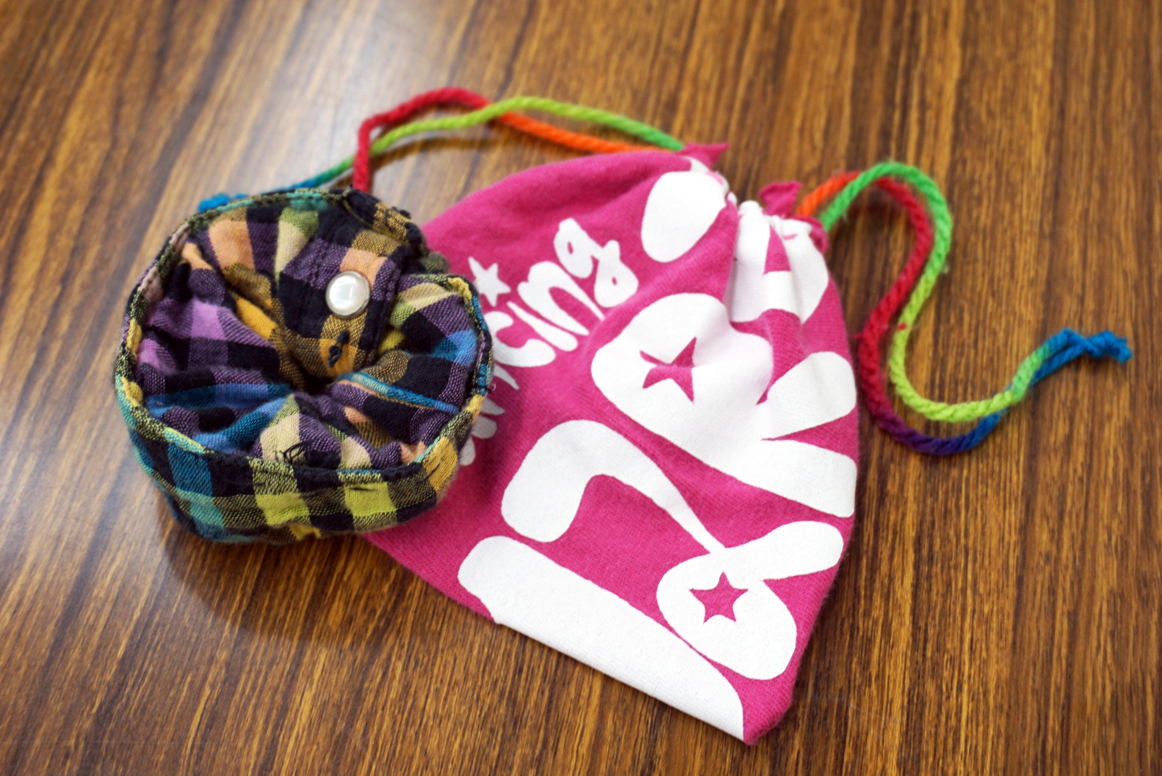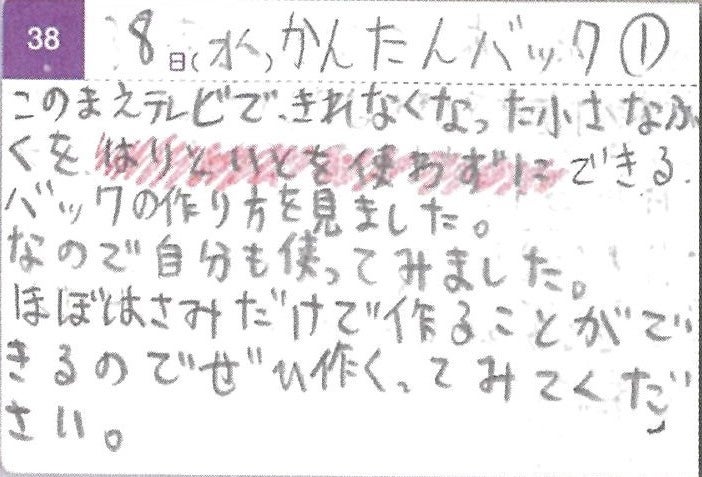 お母さんが汚くなったタオルを雑巾にしているのを見て、サイズが合わなくなってしまったけど、まだ綺麗で可愛い柄の服で何か作りたいなと思いました。切るだけで作れて、下を結んで袋にする所が楽しかったです。簡単なのでまた可愛い模様のエコバッグを作りたいです。