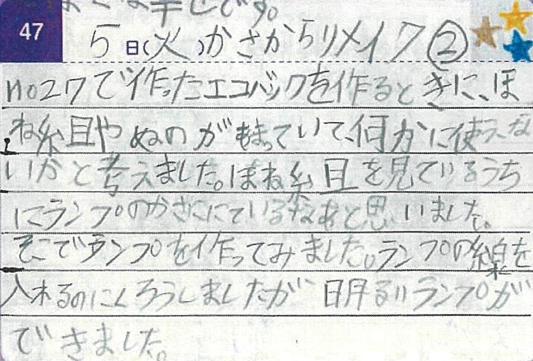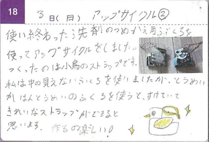 捨てないでとっておいたものがリサイクルできたり、また新しいものとして使えるということがわかったり、ぜんぜん違うものとして使えるのが楽しいと思いました。これからも、ゴミを増やさないように色々やっていきたいです。