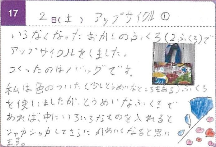 私は、小さくなった洋服を友達の妹にお下がりとしてあげていますが、穴が開いたり汚れてしまった服はあげることができません。この環境日記を通し、私はそういう服や、身の回りにあるいらなくなったものを使ってアップサイクルしてみようと思いました。例えばお菓子袋やお気に入りだったジーンズの布に、ファスナーを縫い付けてポーチにしたり、リボンで取手を付けてバッグにしたりしました。アップサイクルすることで、いらなくなったものを可愛いものや使いやすいものに変えることができて嬉しかったです。