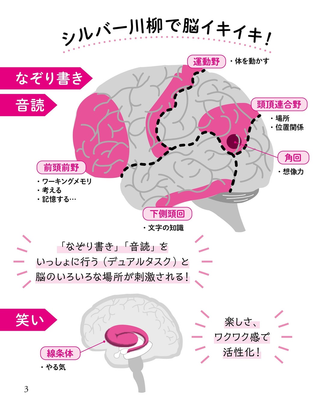 「なぞり書き+大声で音読=大笑い」からもたらされる脳の若返り効果を、メディアでもおなじみ、脳科学の専門家・篠原菊紀氏が巻頭で解説。