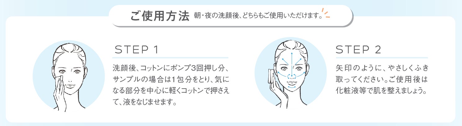STEP1:洗顔後、コットンにポンプ3回押し分、サンプルの場合は1包分をとり、気になる部分を中心に軽くコットンで押さえて、液をなじませます。