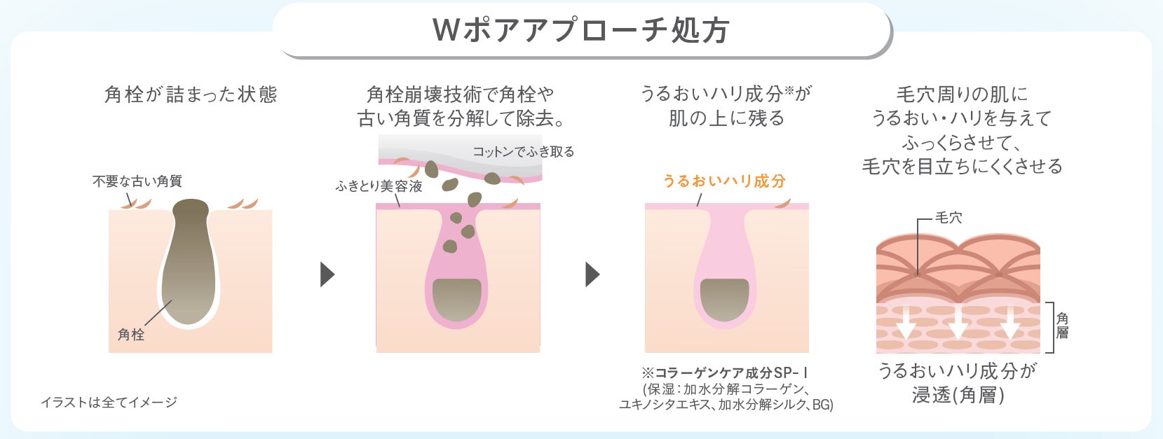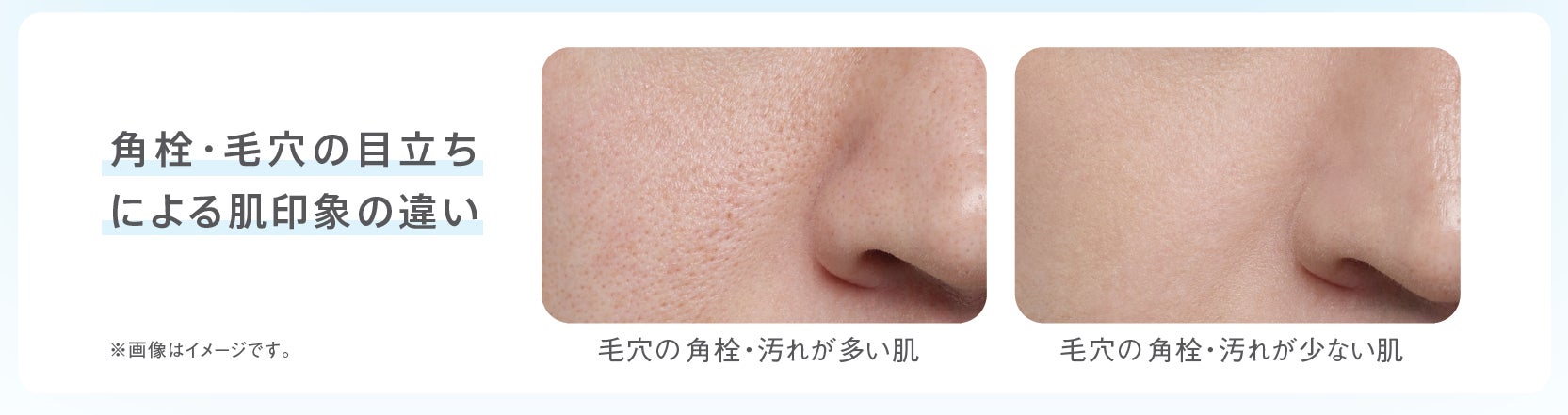 角栓崩壊技術で角栓や古い角質を分解して除去。ふき取った後にも、うるおいハリ成分*が肌の上に残り浸透(角層)し、毛穴周りの肌にうるおい・ハリを与えてふっくらさせ、毛穴を目立ちにくくさせます。