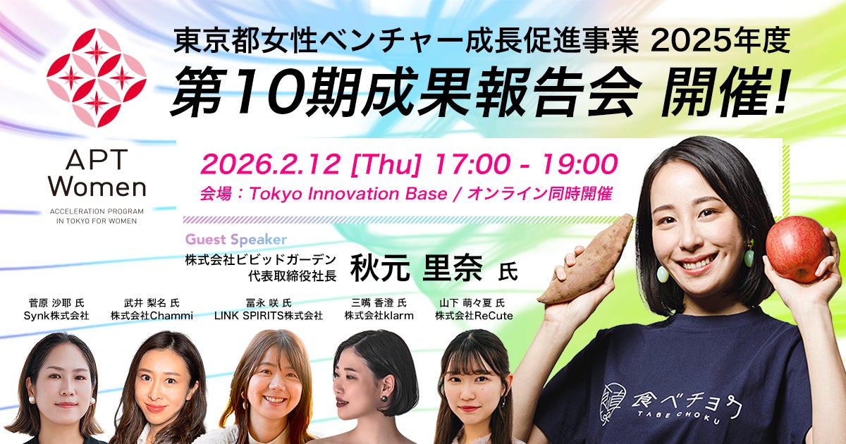 東京都主催女性ベンチャー成長促進事業「APT Women(読み:アプト ウィメン、Acceleration Program in Tokyo for Womenの略)」は、第10期受講生による成果報告会を、2026年2月12日(木)に東京都千代田区の Tokyo Innovation Base で開催します。報告会では、受講生代表によるプログラムを通じて得た成果の発表や、受講生が手掛けた製品・サービスの展示を行います。女性起業家による事業成長をご覧いただける貴重な機会となっておりますので、ぜひご参加ください。