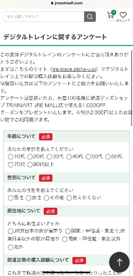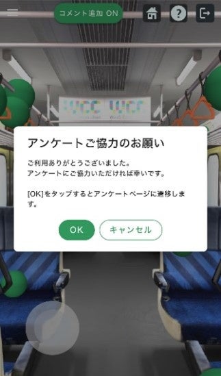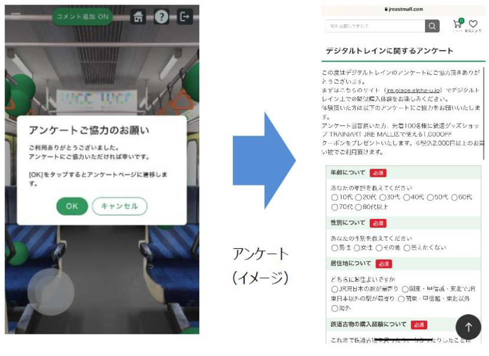 ・体験後にデジタル空間の環境や操作性などに関するアンケートがあり、ご回答いただいた先着100名様に鉄道グッズショップTRAINIART JRE MALL店※3で使える1,000円OFFクーポン※4をプレゼントいたします。アンケートはデジタル空間内の退出マークをタップの上、ご回答ください。