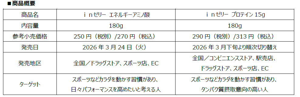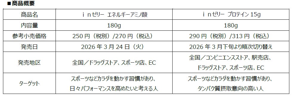 おいしく手軽にどこでも、小腹を満たしながらプロテイン15gと、ビタミンB群7種が素早く摂取できる「inゼリー プロテイン15g」も2026年3月下旬よりデザインをリニューアルします。「inゼリー エネルギーアミノ酸」と共に、日々アクティブに運動されるお客様のパフォーマンスをサポートします。